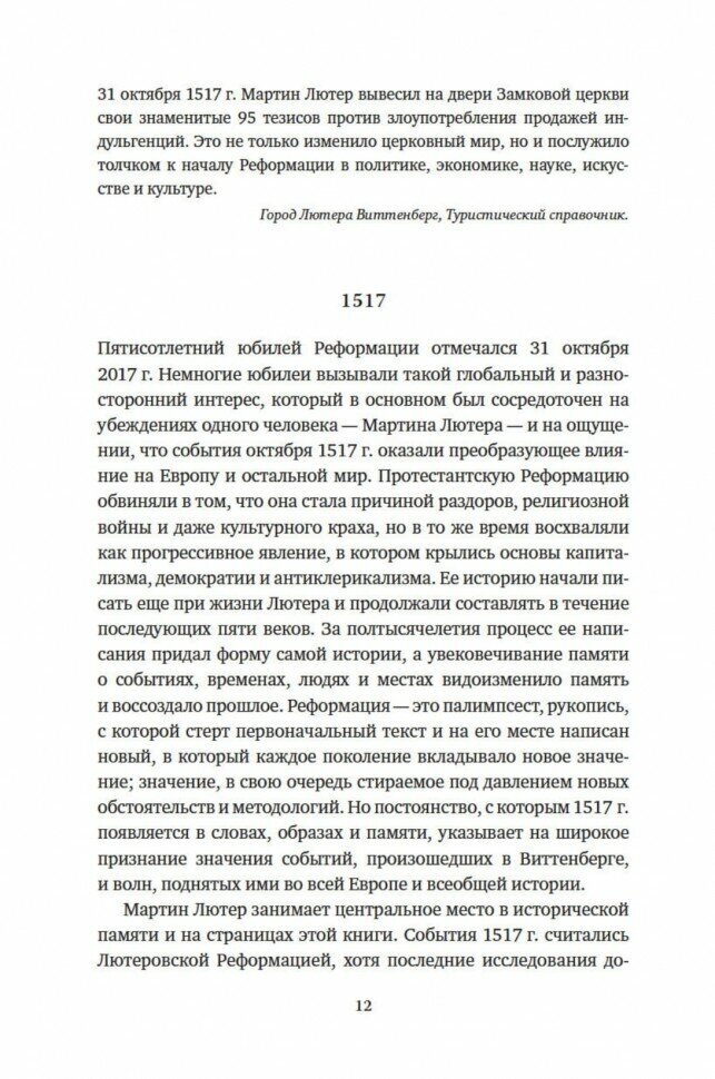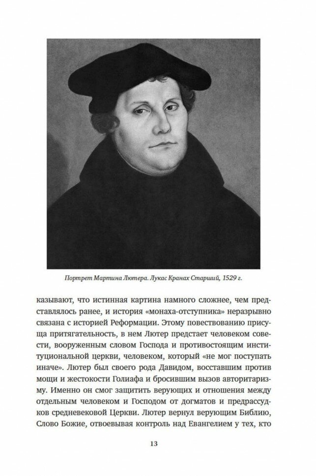 Когда в октябре 1517 года Мартин Лютер прикрепил свои 95 тезисов к двери церкви Всех Святых в Виттенберге, он потряс основы западного христианства. Под сомнение были поставлены все догмы, традиции и приоритеты… Идеи Лютера о реформировании религиозных доктрин и практик и последовавшие протесты против продажи индульгенций раскололи Церковь. Но Реформация в итоге вышла за пределы богословской сферы, приведя к тому, что изменения коснулись отношений между духовной и светской властью, восприятия сверхъестественного, толкования прошлого, понимания роли женщин в обществе и Церкви, а также клерикального взгляда на брак и секс.