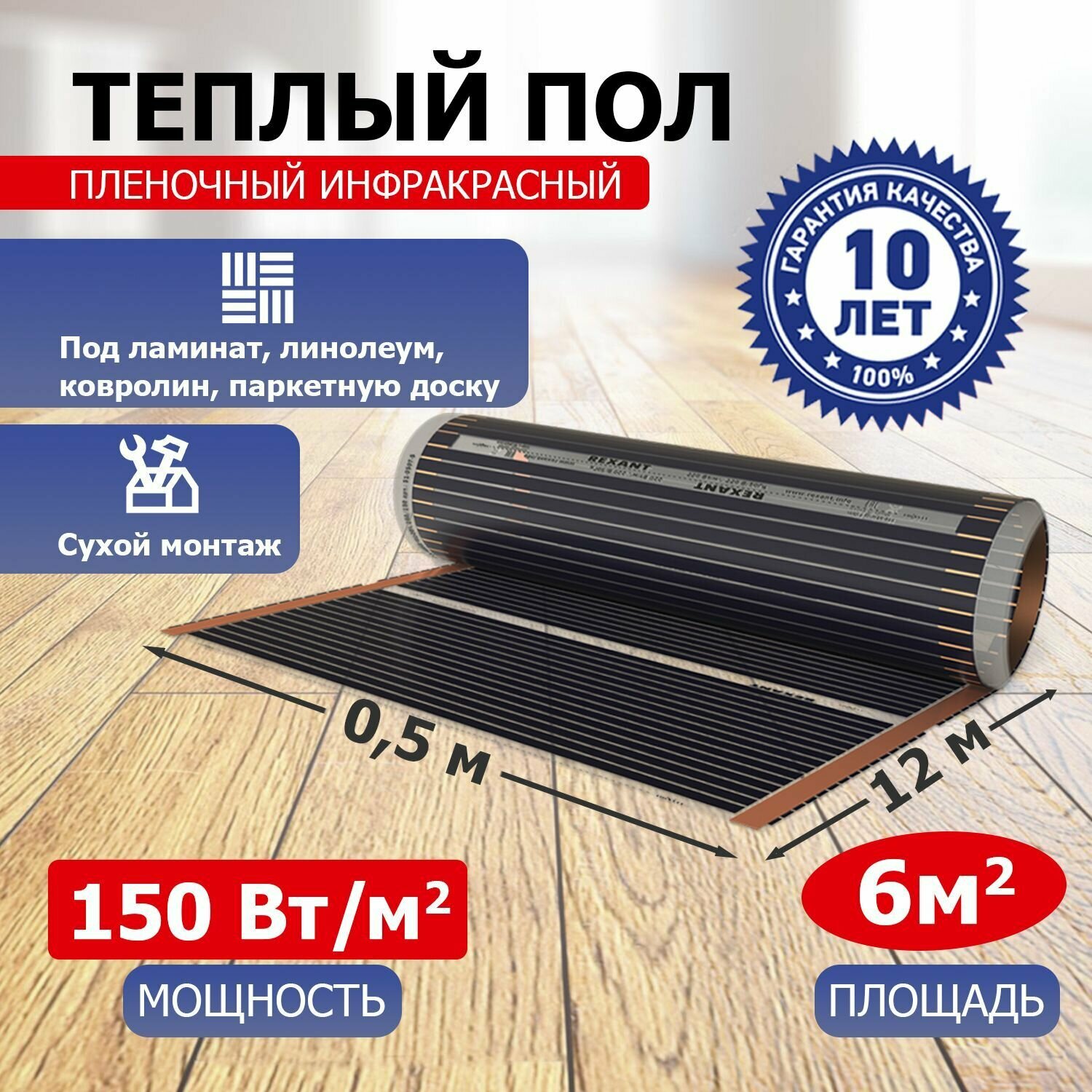 Пленочный теплый пол REXANT— это высокотехнологичное изделие, произведенное на основе углеродной термической пленки. Нагревательную пленку можно применять как в закрытых помещениях, так и на открытых площадках. Разогрев пленки происходит быстро и расход электроэнергии ниже, чем у теплых полов на основе нагревательных кабелей.