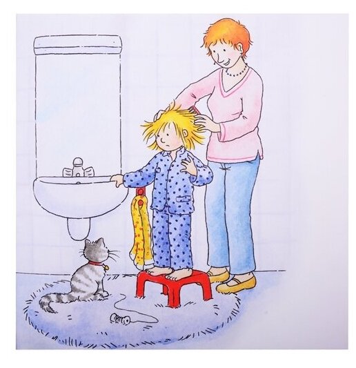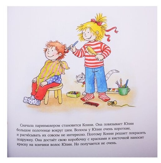 Конни тоже не хотела стричься, ведь даже просто расчёсываться по утрам было больно. Но мама смогла уговорить Конни пойти с ней в парикмахерскую, и оказалось, что там не только не страшно, но даже интересно.