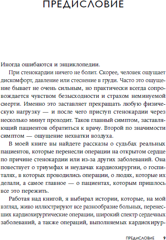 Книга не содержит медицинских терминов и теоретических вкладок, подойдет широкому кругу читателей. Читается легко, сюжеты интересные, в книге – короткие истории об операциях на сердце: трансплантациях, восстановлении аорты, аорто-коронарном шунтировании, а также о проблемах и недостатках Национальной системы здравоохранении Великобритании. Книга в твердом переплете, листы белые плотные, шрифт достаточно крупный. Книга тонкая (240 стр.), читается за один присест. Брала с собой в самолет, получила удовольствие, время пролетело быстро.