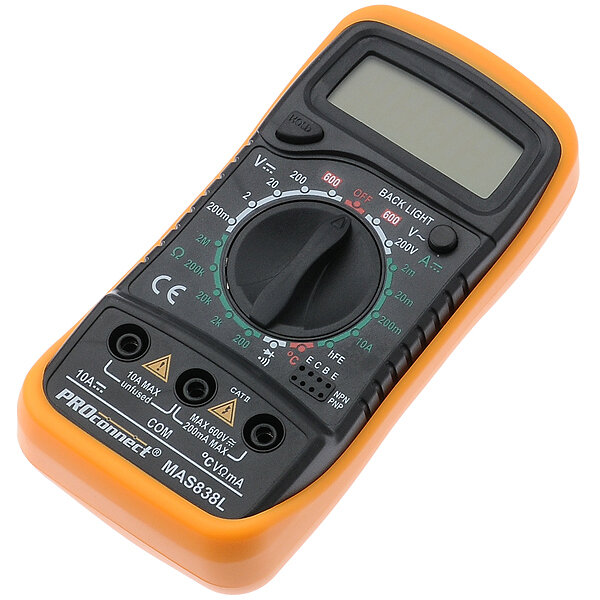 Мульти́метр — электроизмерительный прибор, который включает в себя несколько функций и набор измеряемых параметров. Все приборы серии MAS830 измеряют постоянное и переменное напряжение, постоянный ток, сопротивление в цепи и температуру (для модели 838L). А также с помощью данного прибора можно проводить тестирование диодов и прозвонку целостности цепи. Данные приборы являются более совершенными в линейке мультиметров PROconnect, имеют противоударный бампер, функцию удержания данных на дисплее DATA HOLD — позволяет запомнить данные, если измерение проводится в труднодоступном месте, функцию подсветки дисплея — поможет в темноте или отсутствии электричества и освещения.