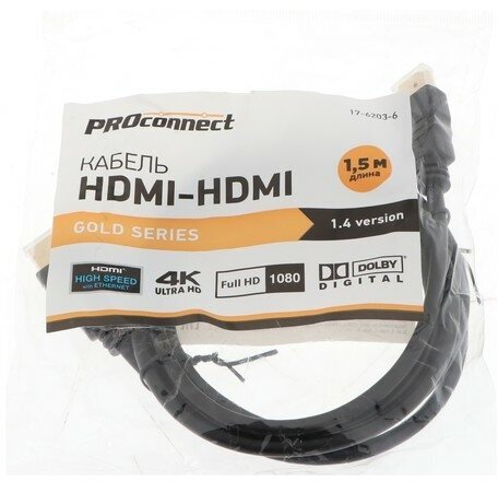 Шнур HDMI — HDMI gold 1.5М с фильтрами (PE bag) PROconnect предназначен для передачи цифровых видеоданных высокого разрешения и многоканальных цифровых аудиосигналов с защитой от копирования. Используется для подключения во многих устройствах нового поколения: телевизионных аппаратах, компьютерах и ноутбуках, мультимедийных проигрывателях, игровых консолях, видеокамерах и других видеоустройствах имеющих соответствующий разъём.