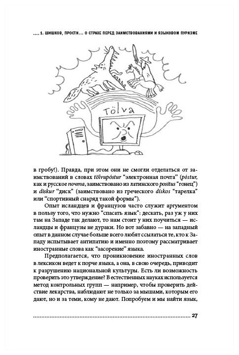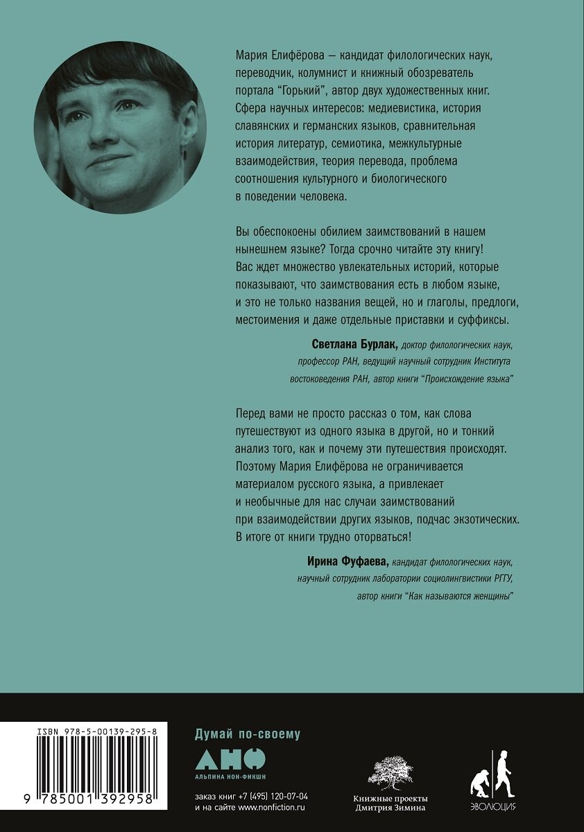 Что такое языковые заимствования? Эта тема, несомненно, волнует каждого из нас. Ее обсуждают в школе, в учебниках, в научной литературе и на интернет-форумах. Вместе с тем популярные экскурсы в область заимствований, выходящие в России, сводятся по большей части к теме иностранных слов в русском языке. А вот что такое заимствование вообще, по каким признакам мы его отличаем, почему оно возникает в языке, почему ему сопротивляются — книги об этом пока не было. Этот пробел и попыталась восполнить филолог-англист Мария Елифёрова. Показывая, как взаимодействуют между собой языки и как складываются судьбы заимствований (речь идет не только о словах), автор, наряду с примерами из русской культуры, истории и литературы, обращается к французскому, немецкому, испанскому и более экзотическим языкам из самых разных уголков земного шара. Эта информационно насыщенная и серьезная книга счастливо сочетает глубину научного анализа с доступным живым изложением, юмором и лояльностью по отношению к бунтарям и нарушителям норм и канонов.