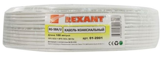 Кабель RG-58 A/U (50 Ом), Cu/Al/Cu, 64 % (бухта 100 м) белый REXANT радиочастотный со вспененной полиэтиленовой изоляцией в ПВХ оболочке. Применяется для передачи высокочастотного сигнала в различных системах связи, подключения внешних антенн, радио- и телевещательных системах.