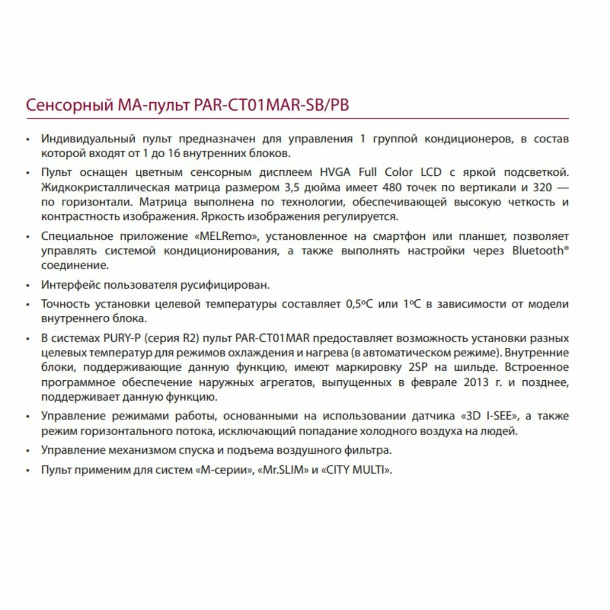 - В системах PURY-P (серия R2) пульт PAR-CT01MAR предоставляет возможность установки разных целевых температур для режимов охлаждения и нагрева (в автоматическом режиме). Внутренние блоки, поддерживающие данную функцию, имеют маркировку 2SP на шильде. Встроенное программное обеспечение наружных агрегатов, выпущенных в феврале 2013 г. и позднее, поддерживает данную функцию