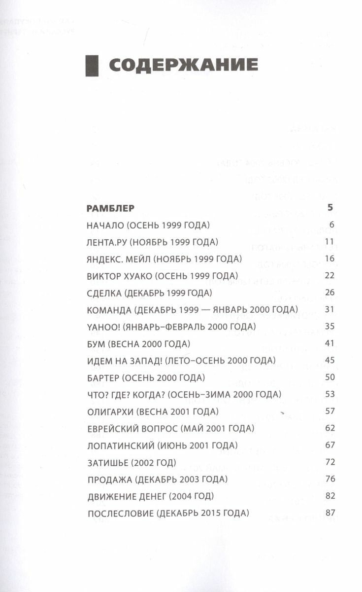 В книге описана история становления одного из первых и легендарных российских интернет-порталов — Рамблера. Какие вызовы стояли в те дни перед зарождавшимся интернет-бизнесом, какие проблемы приходилось решать и чем все это закончилось. В середине 2000-х автор вместе с партнерами взялся за освоение украинского интернет-пространства; здесь в перипетии жесткого и конкурентного бизнеса начали вплетаться политика и война. Это реальная хроника событий, фактов, удач и поражений в российском и украинском интернете глазами одного из его первопроходцев. Но эта книга не только про интернет, она — откровенный рассказ автора об инвестициях, людях, бизнесе и политике.