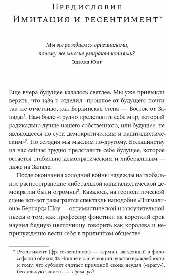 Эпоха великих перемен, которая, как считалось, наступила после краха коммунизма и «конца истории», стала временем не реальной трансформации государств по западной модели, а имитации, часто — весьма поверхностной. Но притворство рано или поздно приводит к обратной реакции. Через три десятилетия игры по западным правилам многим «ученикам» надоело терпеть моральное превосходство «учителей» — тем более что сами страны Запада оказались далеки от идеала, что показали многочисленные случаи коррупции, военных преступлений, пренебрежения правами человека и ограничения свободы слова.