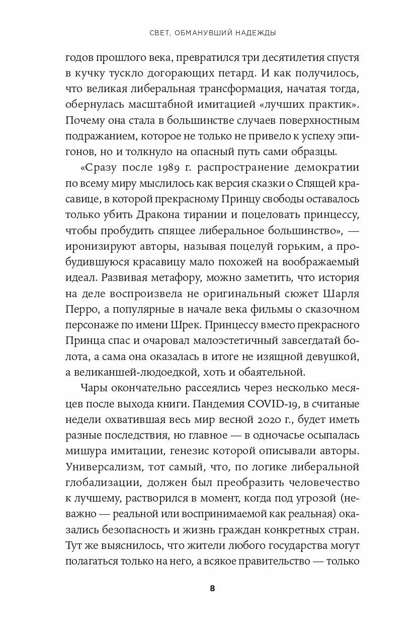 Подражание американской демократии, начатое в конце ХХ века многими странами Восточной Европы, неизбежно обернулось имитационным либерализмом. Отсюда - столь популярная в последние десятилетия тяга к истинной национальной подлинности (стремление к космополитизму иронично обернулось скрытым национализмом). Книга ясно объясняет, почему подобное стремление изначально было обречено на провал и как это происходило.