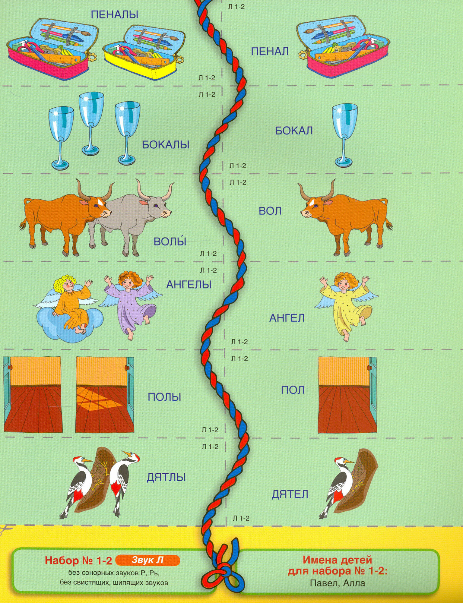 Каждый набор состоит из 12 карточек, соединённых цветным шнурком, на которых изображены 24 предметные картинки. Карточки двусторонние. Наборы отличаются цветовым фоном. К наборам прилагаются карточки с изображением мальчика, девочки. При составлении наборов не использовались картинки с оппозиционными звуками, близкими к закрепляемому, поэтому в наборах на сонорные звуки (Л, Ль) не встречаются сонорные звуки (Р, Рь).