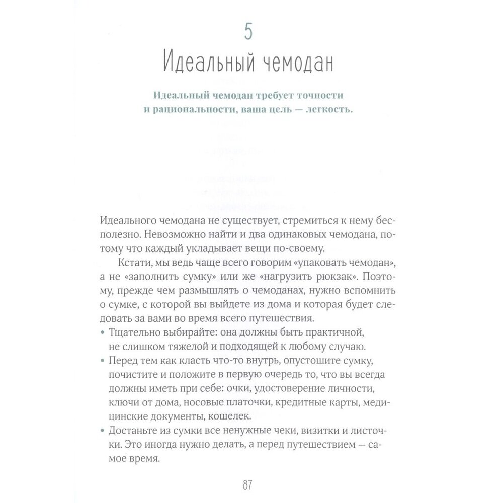 Мария Летиция Польверини — писатель из Рима, заядлая туристка и эксперт по умной уборке — делится собственным опытом, предлагает ценные лайфхаки, психологические секреты и щедрую дозу юмора. В книге есть исключительно практичные вспомогательные материалы: удобные таблицы с конкретными списками вещей для разных путешествий в зависимости от пола и возраста путешественников, целей и продолжительности поездки. Но помимо чисто прикладной пользы автор добавляет нашим чемоданам философское измерение, помогая осознать, что организация своего багажа — это метафора отношений с жизнью в целом, а научиться грамотно укладывать чемодан — это не только полезный навык, но еще и шанс лучше понять себя и других. Легче станет не только ваш чемодан, но и ваша жизнь!