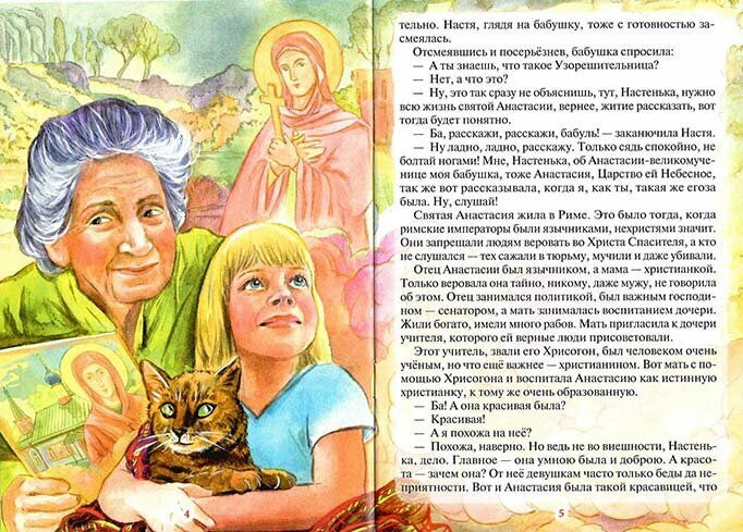 Эта маленькая книжечка давно уже получила одобрение читателей - она переиздавалась много раз и всегда остается востребованной. Житие святой великомученицы рассказывает своей внучке-имениннице Насте её бабушка Анастасия, тоже именинница. Книгу удачно выделяет то, что написана она живо, доступно, читается легко и с интересом.