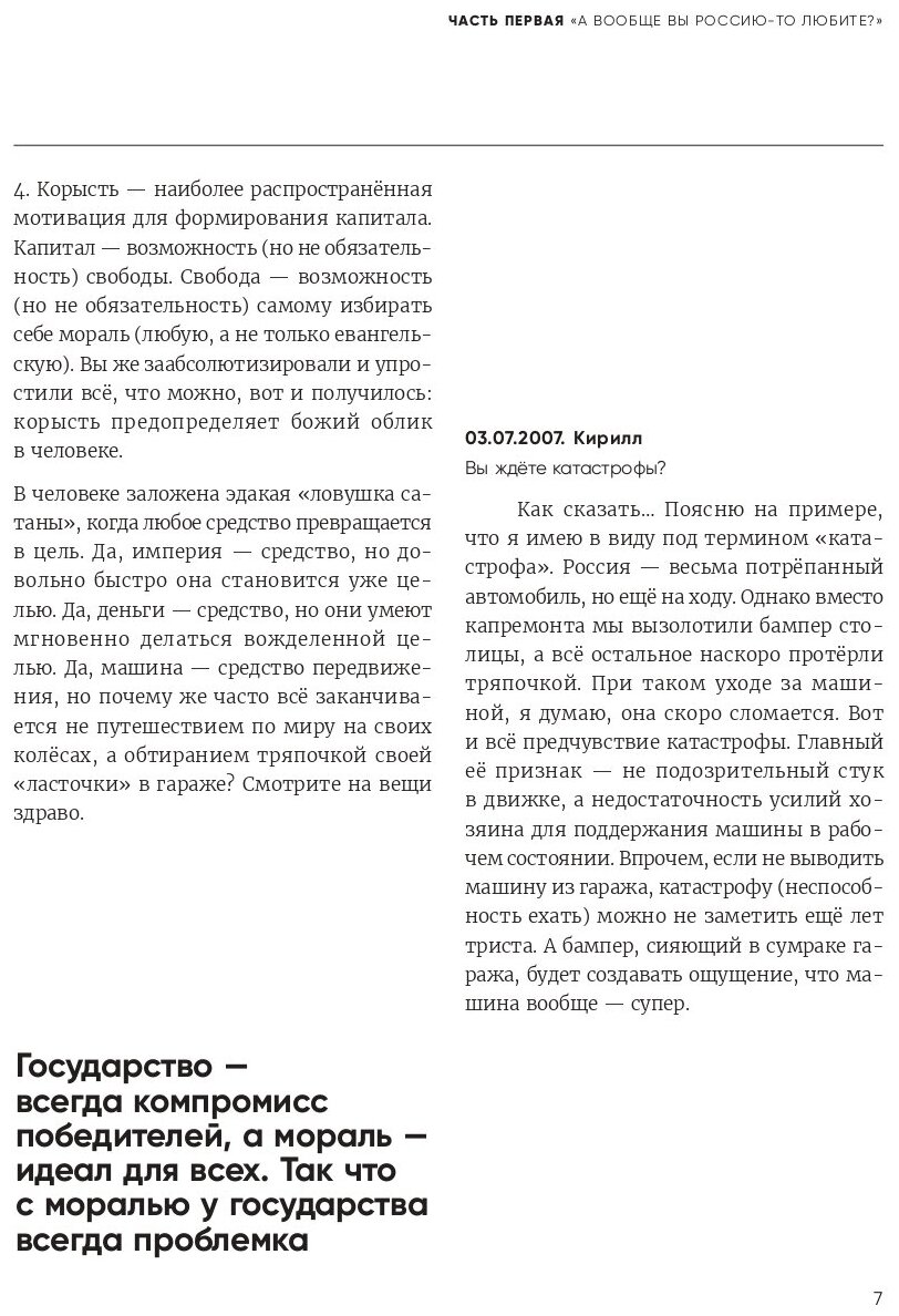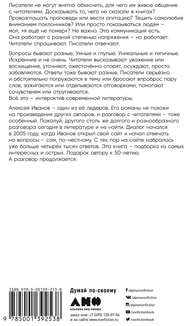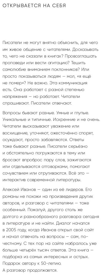 Этот сборник — результат 15-летнего диалога писателя Алексея Иванова со своими читателями. Вначале это была переписка в вопросах и ответах, затем она переросла сетевой формат и превратилась в многосторонний анализ нашей жизни и процессов, происходящих в политике, экономике, публицистике, культуре и писательском ремесле.