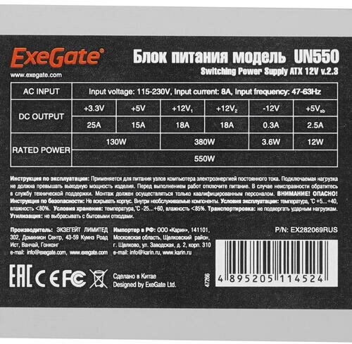 Блок питания ATX Exegate EX282069RUS 550W 12cm fan 24p+4p 6/8p PCI-E 3*SATA 2*IDE FDD UN550