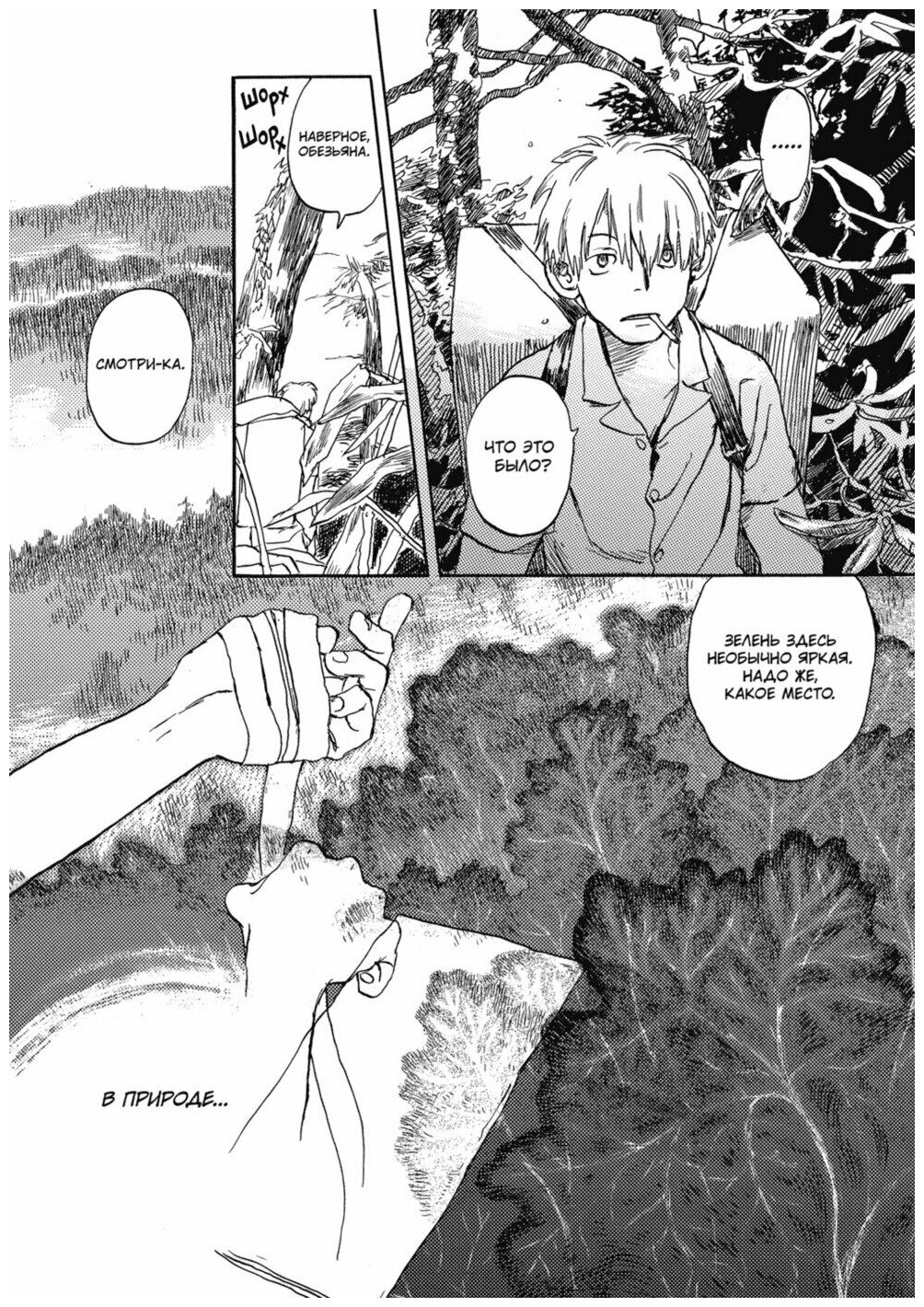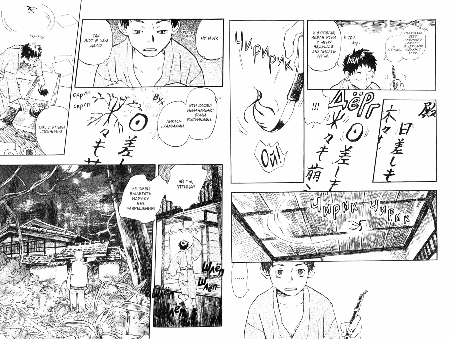 Каждая глава - отдельная история о странствиях по средневековой Японии главного героя Гинко, который помогает людям жить в гармонии с неведомыми существами - муси. К нему обращаются как к врачу, который лечит людские "болезни", вызванные случайным взаимодействием с муси. Еще с первого прочтения и просмотра аниме 4 глава 1 тома моя самая любимая. Очень жуткая.