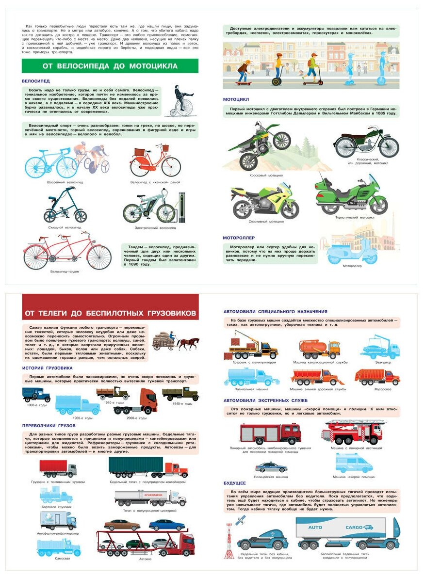 Как только первобытные люди научились охотиться, они задумались о транспорте. Не о метро или автобусе, конечно. А о том, что добычу надо как-то дотащить до костра в пещере. Энциклопедия с наклейками "Транспорт. На земле, на воде, в воздухе" расскажет юным любителям техники не только о современных автомобилях, самолетах и вертолетах, поездах и кораблях, но и об истории их изобретения, о том, как раньше выглядели и как были устроены транспортные средства, и какими они будут в недалеком будущем.