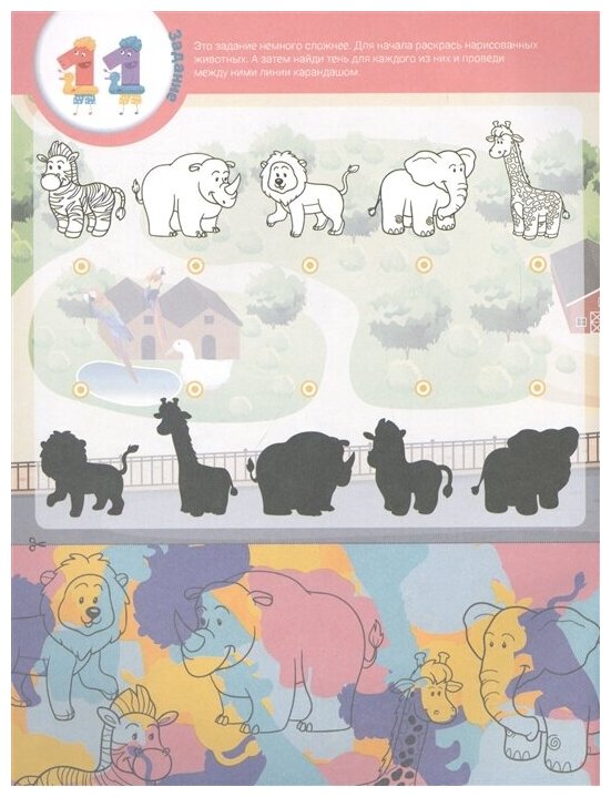В этой книге знакомимся с различными животными, считаем птиц, угадываем, где чья тень, собираем части целого и, конечно, вырезаем и наклеиваем зверей!