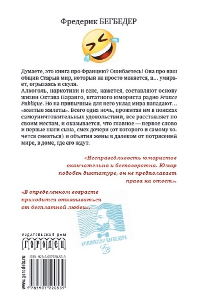 Новый роман Фредерика Бегбедера завершает, а может, продолжает цикл о «жизни и приключениях Октава Паранго, которого мы оставили где-то в России… Если бы мы писали для вас газетные анонсы, то вы наверняка увидели бы заголовки типа: Бегбедер против диктатуры смеха! Бегбедер о себе, нас и эпохе, когда шуты захватили власть. Бегбедер вернулся, мы его ждали!»