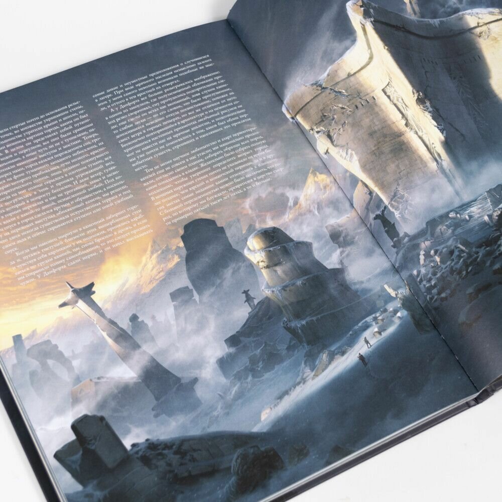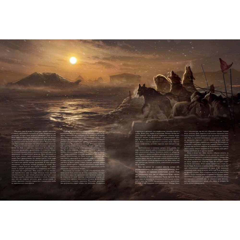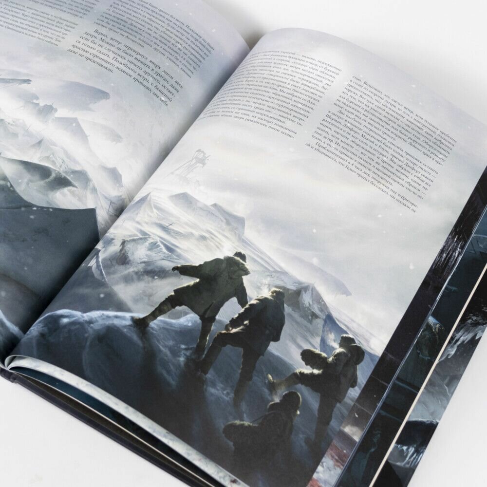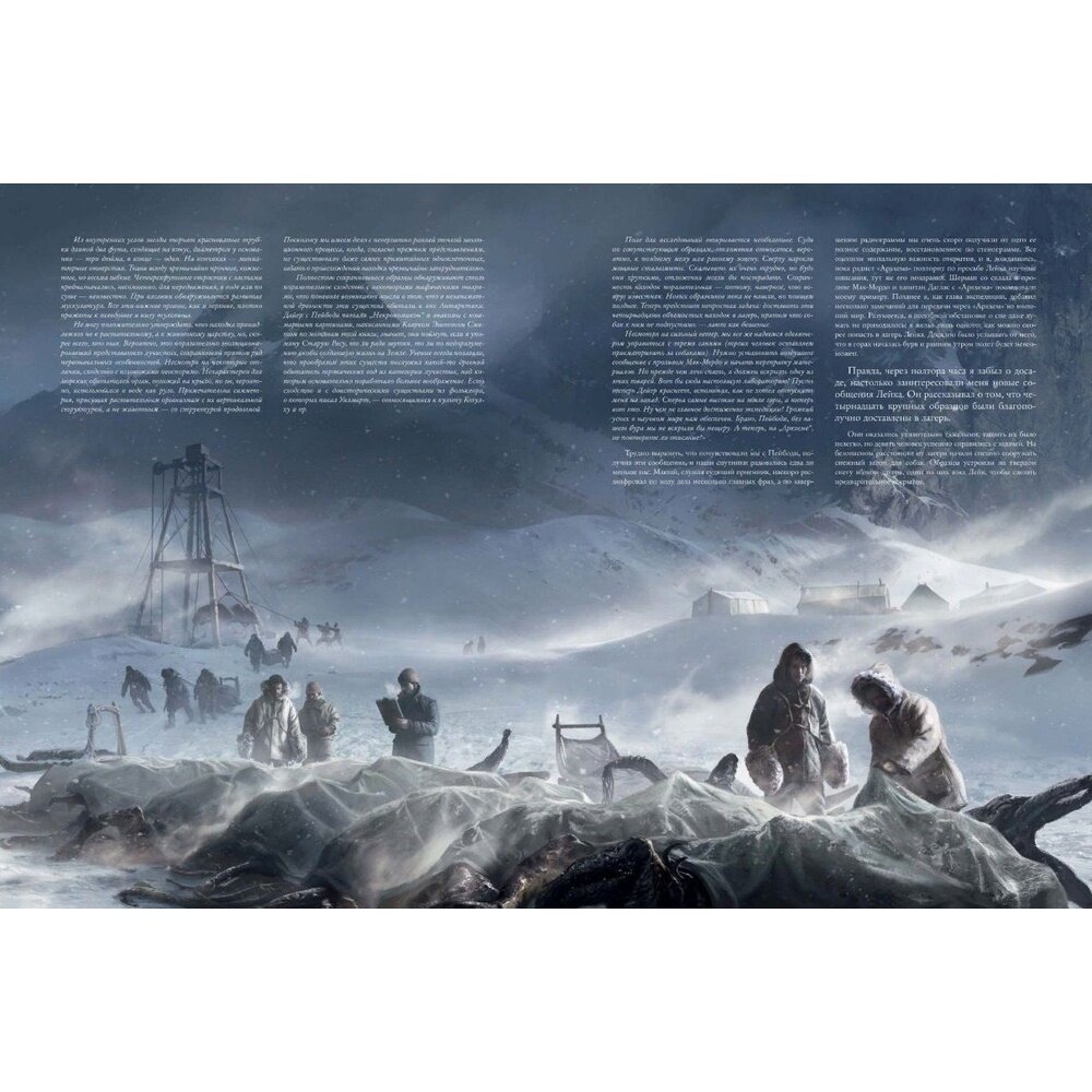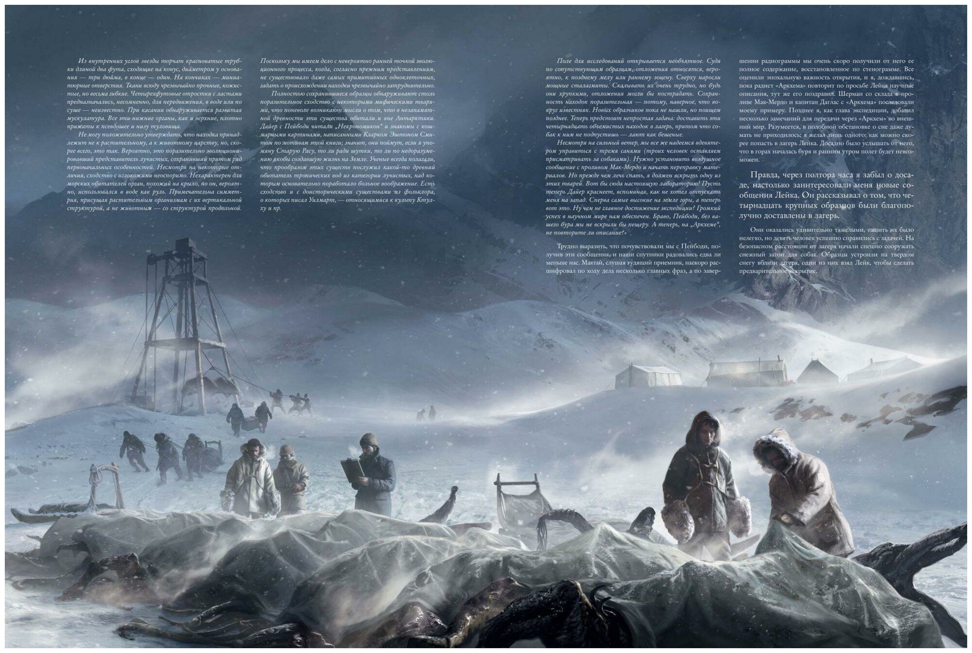 Хребты Безумия по праву считается одним из самых знаковых произведений Говарда Лавкрафта, поэтому не удивительно, что художник Барандже решил его проиллюстрировать. После его шикарного арта в "Зове Ктулху" в этой книге я ждал не меньшего и не разочаровался. Про сам рассказ я рассказывать не буду (он и так очень известен), а вот про художественную часть сказать точно стоит. Барандже по большей части создает концепт-арты для кинофильмов и игр, поэтому и техника рисования у него соответствующая. Он применяет смешанный стиль цифрового арта, акварельной техники и карандашного рисунка. Самое сложное происходит на этапе композитинга, когда все составляющие вроде ручной зарисовки, текстур, слоев и фильтров нужно свести в едино, чтобы финальное полотно смотрелось максимально реалистично и цельно. Здесь это получилось в полной мере, без сомнений. На иллюстрациях ярко отображены заснеженные локации, объятые колючим холодом, монументальные построения древней цивилизации, выполненные просто с потрясающим, архитектурным дизайном, и просто невероятно реалистичные погодные эффекты. Также замечательно показаны сцены аутопсии неведомых существ (привет, кинофильм Нечто) со всеми вытекающими жуткими подробностями. А персонажи здесь еще лучше вписаны в фон, чем это было в прошлой работе художника. Мне хочется верить, что если бы Гильермо Дель Торо наконец смог бы приступить к экранизации Хребтов Безумия, то он бы непременно воспользовался художественным видением Барандже, для создания визуального ряда своего фильма.