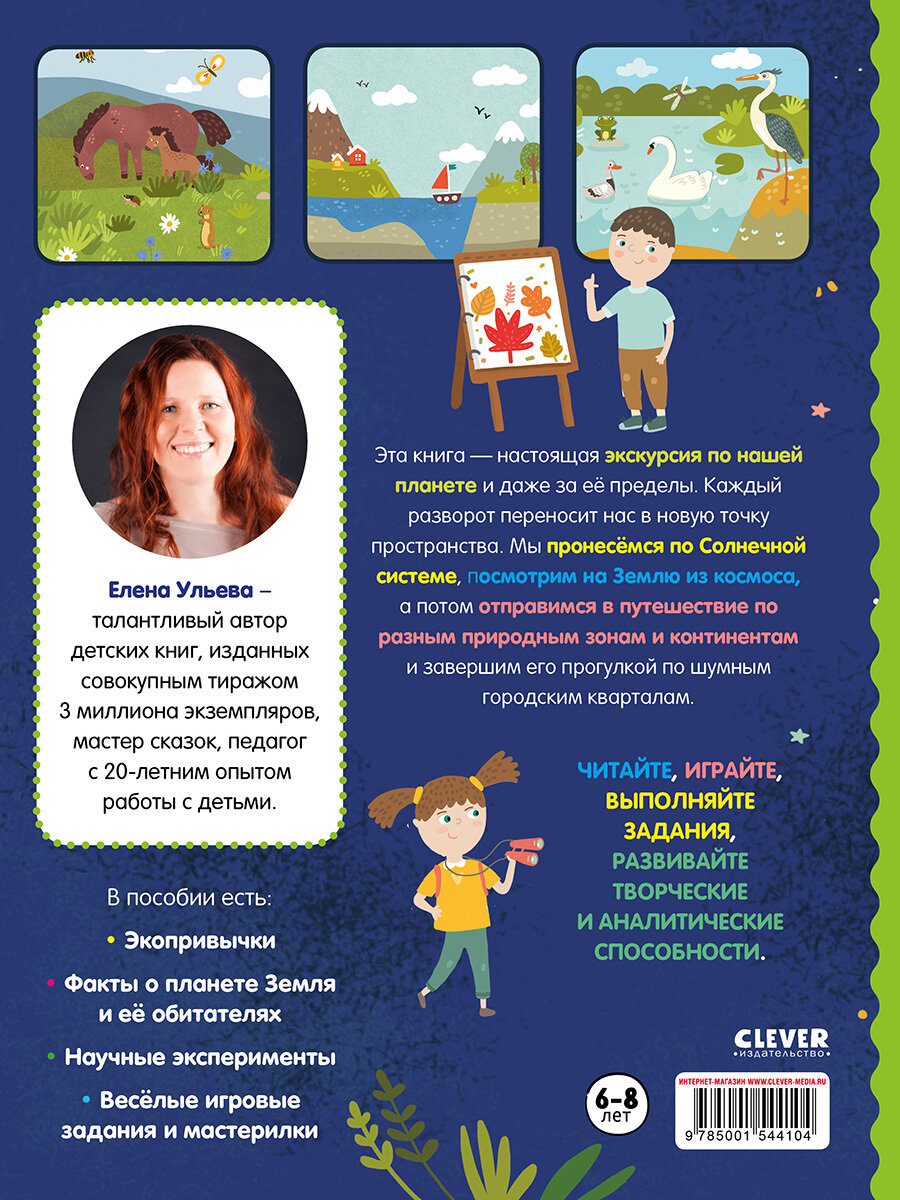 Елена Ульева - талантливый автор детских книг, изданных совокупным тиражом 3 миллиона экземпляров, мастер сказок, педагог с 20-летним опытом работы с детьми. Эта книга - настоящая экскурсия по нашей планете и даже за ее пределы. Каждый разворот переносит нас в новую точку пространства. Мы пронесемся по Солнечной системе, посмотрим на Землю из космоса, а потом отправимся в путешествие по разным природным зонам и континентам и завершим его прогулкой по шумным городским кварталам. Читайте, играйте, выполняйте задания, развивайте творческие и аналитические способности. В пособии есть: - Экопривычки - Факты о планете Земля и ее обитателях - Научные эксперименты - Веселые игровые задания и мастерилки