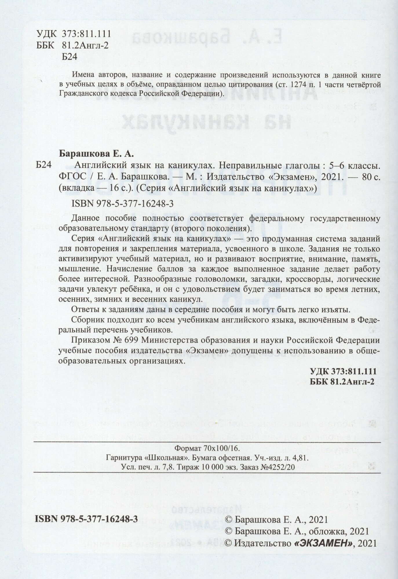 Английский язык на каникулах. Неправильные глаголы. 5-6 класс ФГОС. (Барашкова Елена Александровна); Экзамен Издательство, 2021