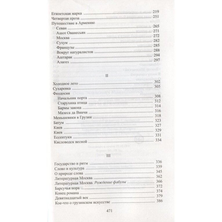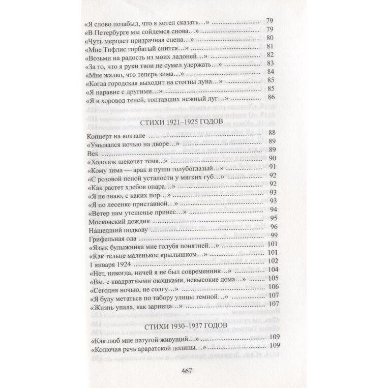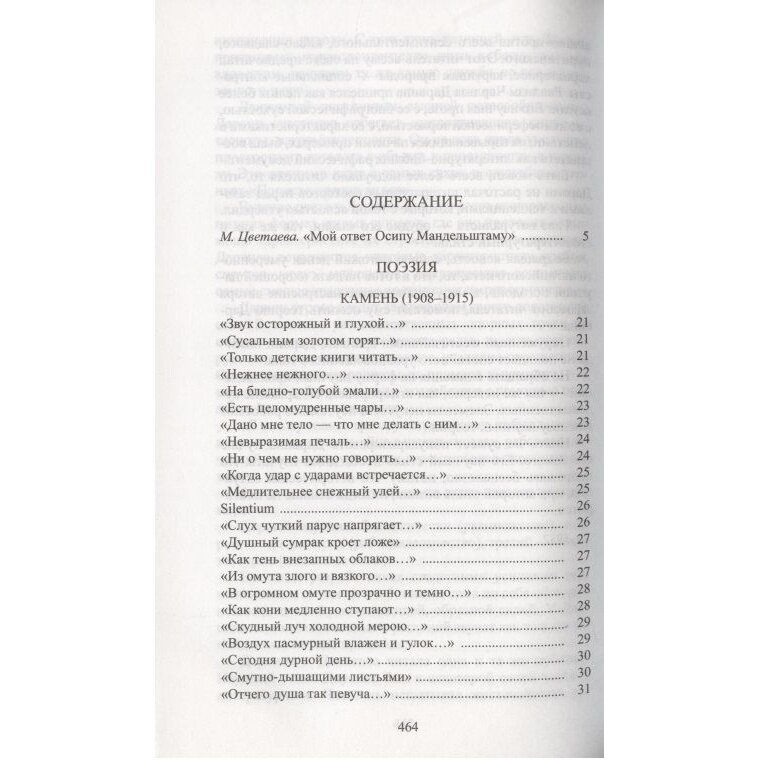 В сборник вошли поэтические циклы «Камень», «Tristia», стихи разных лет, а также проза: «Шум времени», «Путешествие в Армению», «Четвертая проза», «Египетская марка», литературная критика и публицистика.