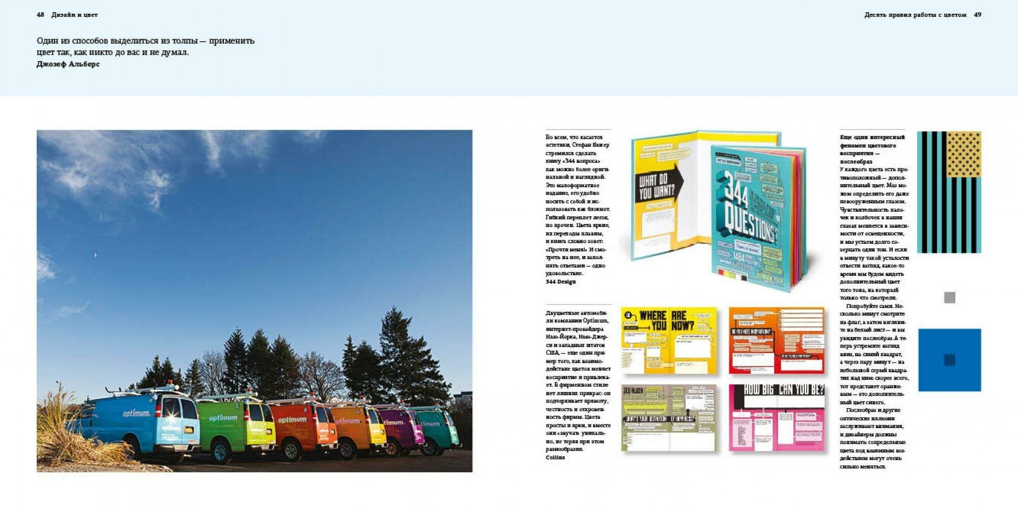 Для тех, кто давно в дизайне некоторая информация может быть неактуальна, так как книга начинается с основы цветовой науки, но все же стоит заглянуть в главу с примерами и раздорами — для повторения материала, пополнения визуальной базы и просто ради интереса)