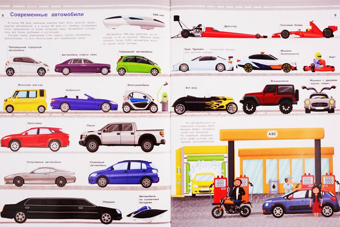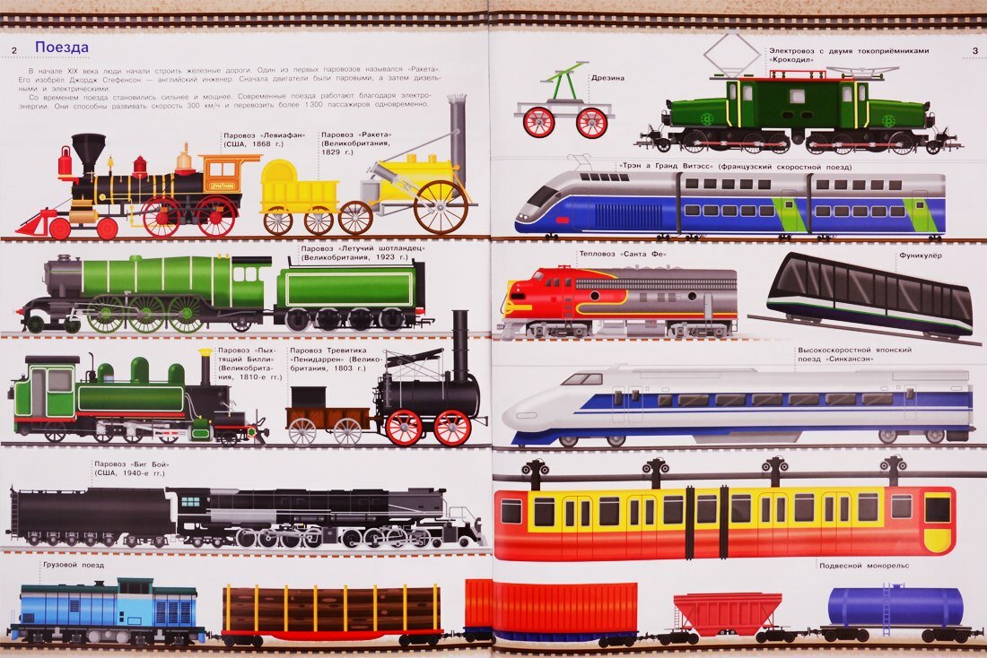 .На разворотах книги можно найти информацию по истории развития сухопутного транспорта – от изобретения колеса к созданию простейшей повозки в виде тачки или телеги, их постепенная трансформация в примитивный самодвижущийся агрегат с простейшим двигателем внутреннего сгорания и дальнейшее стремительное превращение в невероятное разнообразие современных поездов, мотоциклов и автомобилей.