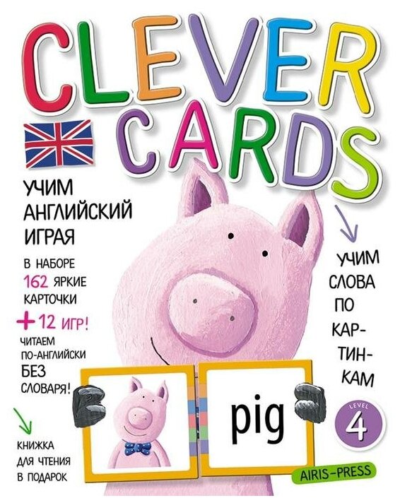 Набор Clever Cards. Level 4 поможет ребёнку быстро и с удовольствием освоить значительную часть лексики начальной школы, научит читать английские тексты без словаря! В наборе 144 яркие карточки и 12 игр разной сложности. Для каждого изображения есть парная карточка с названием. На всех карточках находится цветовой ключ, с помощью которого ребёнок может сам проверить, правильно ли он подобрал слово. Благодаря понятной инструкции взрослые легко смогут сделать занятия с ребёнком интересными и результативными.