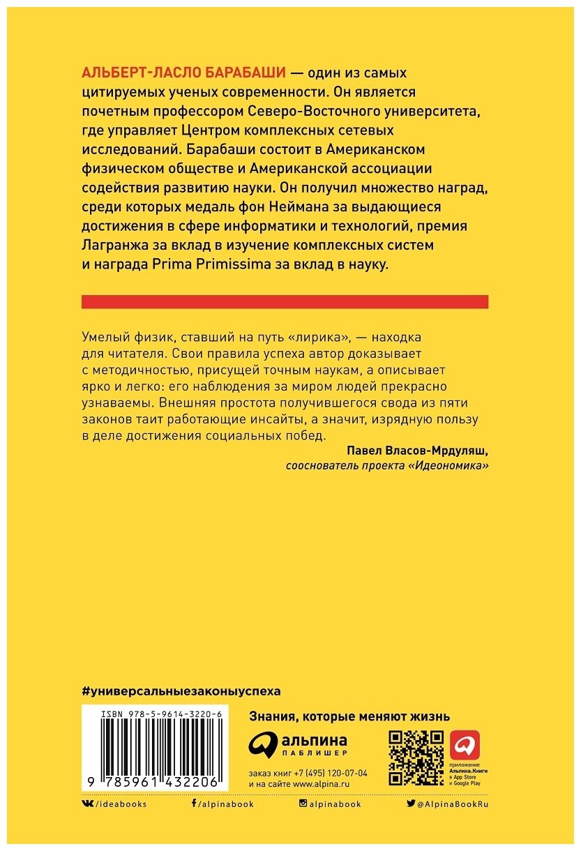 Один из самых цитируемых ученых современности Альберт-Ласло Барабаши решил применить научные методы, чтобы вывести формулу успеха. Он изучил судьбы тысяч ученых, спортсменов, людей искусства и выявил пять универсальных законов успеха. Эти законы помогают понять, какие невидимые силы влияют на наши достижения и провалы. Но главное — используя эти законы, вы сможете добиться признания в любом деле.