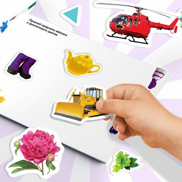 Книжка с наклейками нам понравилась, наклеек много, картинки хоть и небольшие, но четкие и яркие. Ребенок 2 года с удовольствием ищет знакомые предметы и приклеивает их. Хорошая идея приклеивать наклейки на разные страницы по цветам и формам. И игра, и обучение. Наклейки не многоразовые, после приклеивания не отклеятся. Наклеек так много, что мы несколько дней уже по чуть-чуть играем в книжку