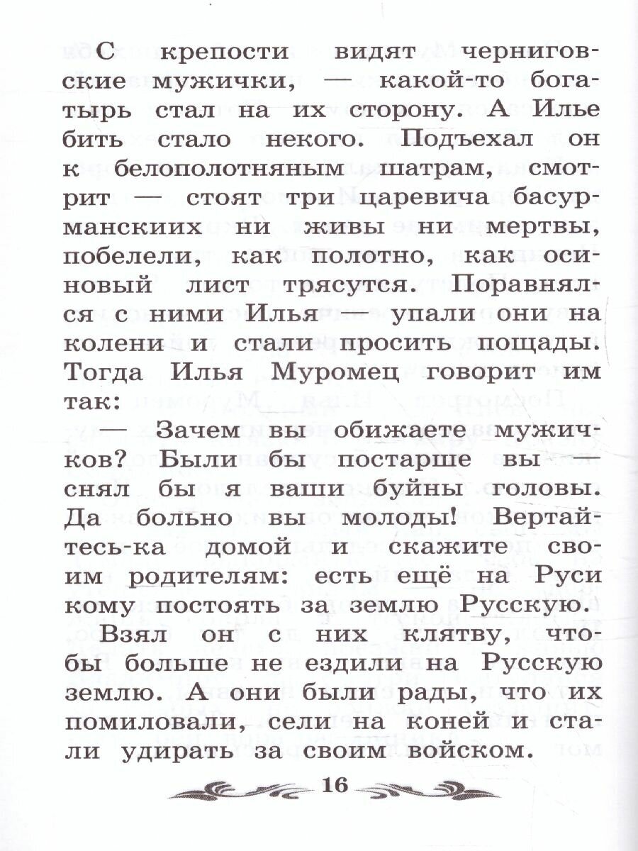 Былина - жанр древнерусской литературы, сказание о богатырях, народных героях и исторических событиях Древней Руси. Давным-давно былины называли "старинами", "старинушками", то есть рассказами о том, что было в далёком прошлом. Былины рассказывают о подвигах прославленных богатырей, это героический эпос русского народа. Русские богатыри - бесстрашные воины, обладающие невероятной силой. И кони у богатырей не простые: они разговаривают человеческим голосом, чуют опасность и всегда приходят на помощь своим хозяевам. Илья Муромец - один из главных героев древнерусского былинного эпоса, защитник Русской земли, грозный для врагов, верный и справедливый - для своих. По легенде, страдал от паралича до 33 лет, но, получив силу от ангелов-странников, он становится героем, который верно служит князю Владимиру и храбро сражается с Соловьем-разбойником, Идолищем, татарами и другими врагами Руси. Илья Муромец бесстрашен, но и не рубит с плеча, он рассудителен, он никогда не обидит слабого или невиновного. Он знает об опасности, но не сворачивает с пути, смело вступает в бой с Соловьем-разбойником. Образ Ильи Муромца лишь отчасти сказочный персонаж, у него есть и исторический прототип. Историки до сих пор спорят, кто же был прообразом Ильи Муромца, но большинство склоняется к тому, что это воин по прозвищу Чоботок (то есть Сапожок), живший в XII веке. Однажды он отбился от врагов с помощью этой обуви. Много лет он сражался за Русскую землю, совершил немало ратных подвигов, а потом постригся в монахи. Похоронен Илья Муромец в Киево-Печерской лавре.