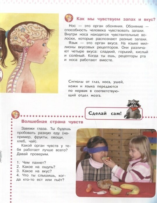 Часть пояснительного текста книги выделена крупным шрифтом, чтобы его смог прочесть сам ребёнок, а весёлый енот, появляющийся на страницах энциклопедии, будет давать небольшие задания и поможет лучше усвоить изложенный материал.