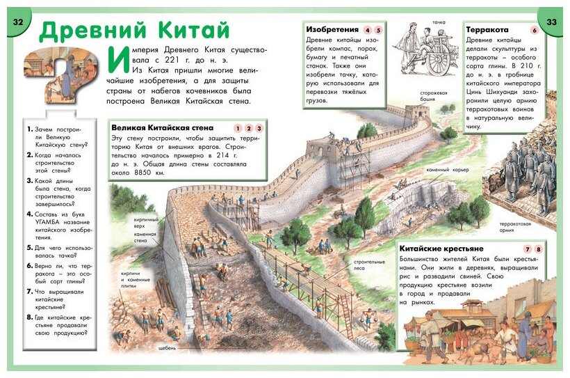 Эта иллюстрированная энциклопедия в форме вопросов и ответов – незаменимое пособие для школьников. Вы узнаете, как строилась Великая Китайская стена, чем украшали свои дома кельты, кто изобрёл первый алфавит и когда был открыт тоннель под Ла-Маншем. Прошлое и настоящее оживает на цветных иллюстрациях и картах. Одни вопросы покажутся вам лёгкими, ответ на другие придётся поискать в тексте. Проверить себя можно, заглянув в последний раздел книги.