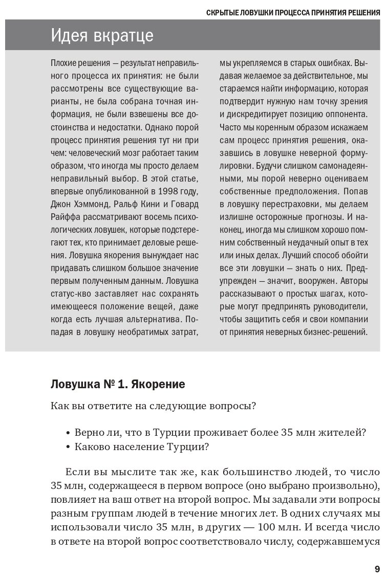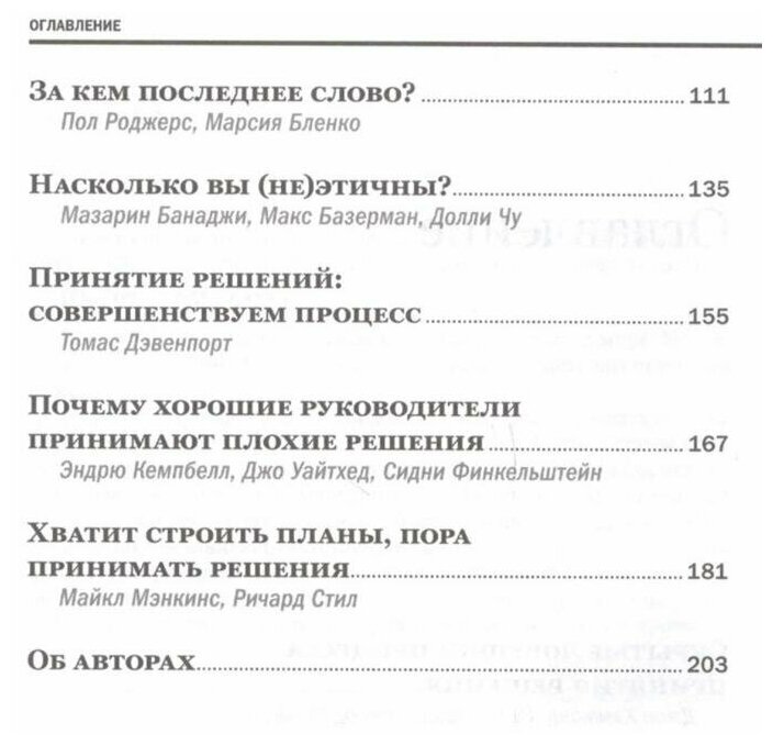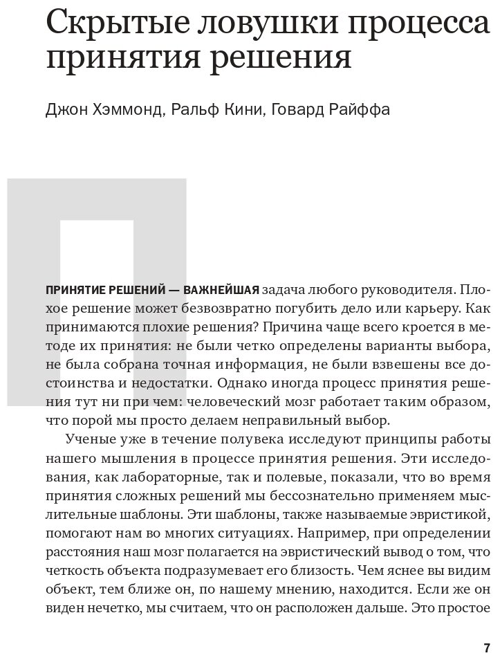 Если вам необходимо оптимизировать и усовершенствовать процесс принятия решений в компании, эта книга для вас. Из сотен статей HBR, посвященных такой важной для руководителей теме, мы выбрали самые полезные и применимые на практике. Вы узнаете, как правильно собрать и проанализировать всю необходимую информацию; как обеспечить максимальную ответственность сотрудников; как не угодить в самые распространенные психологические ловушки. И самое главное: вы сможете подобрать подходящие лично вам методы принятия решений и с их помощью успешно внедрять в жизнь каждый ваш проект.