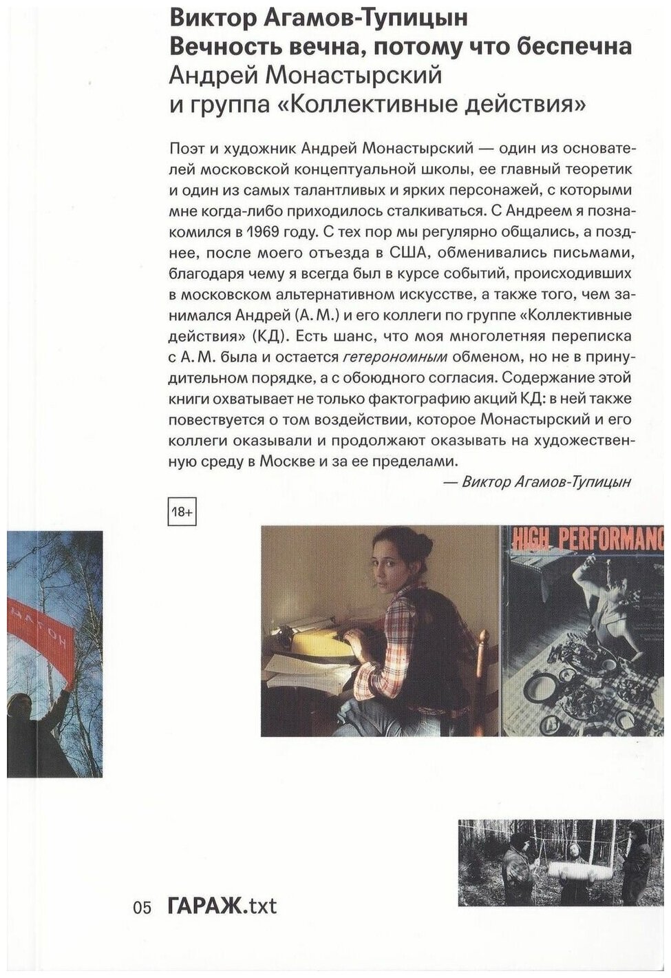 В основу книги «Вечность вечна, потому что беспечна. Андрей Монастырский и группа “Коллективные действия”» положена многолетняя переписка философа и поэта Виктора Агамова-Тупицына с поэтом, художником, основателем группы «Коллективные действия» и главным теоретиком московской концептуальной школы Андреем Монастырским (они познакомились в 1969 году). Содержание книги охватывает не только акции группы «Коллективные действия», но и рассказывает о том воздействии, которое Монастырский и его коллеги оказывали и продолжают оказывать на художественную среду в Москве и за ее пределами. Книга дает возможность познакомиться с теоретическими текстами и стихами Андрея Монастырского и Виктора Агамова-Тупицына, а также с их интерпретациями различных художественных и общественно-политических событий, происходивших в период переписки.