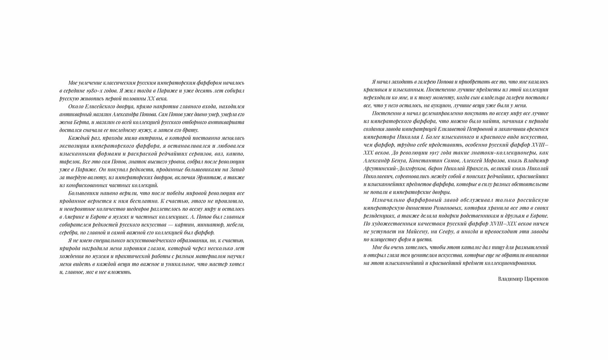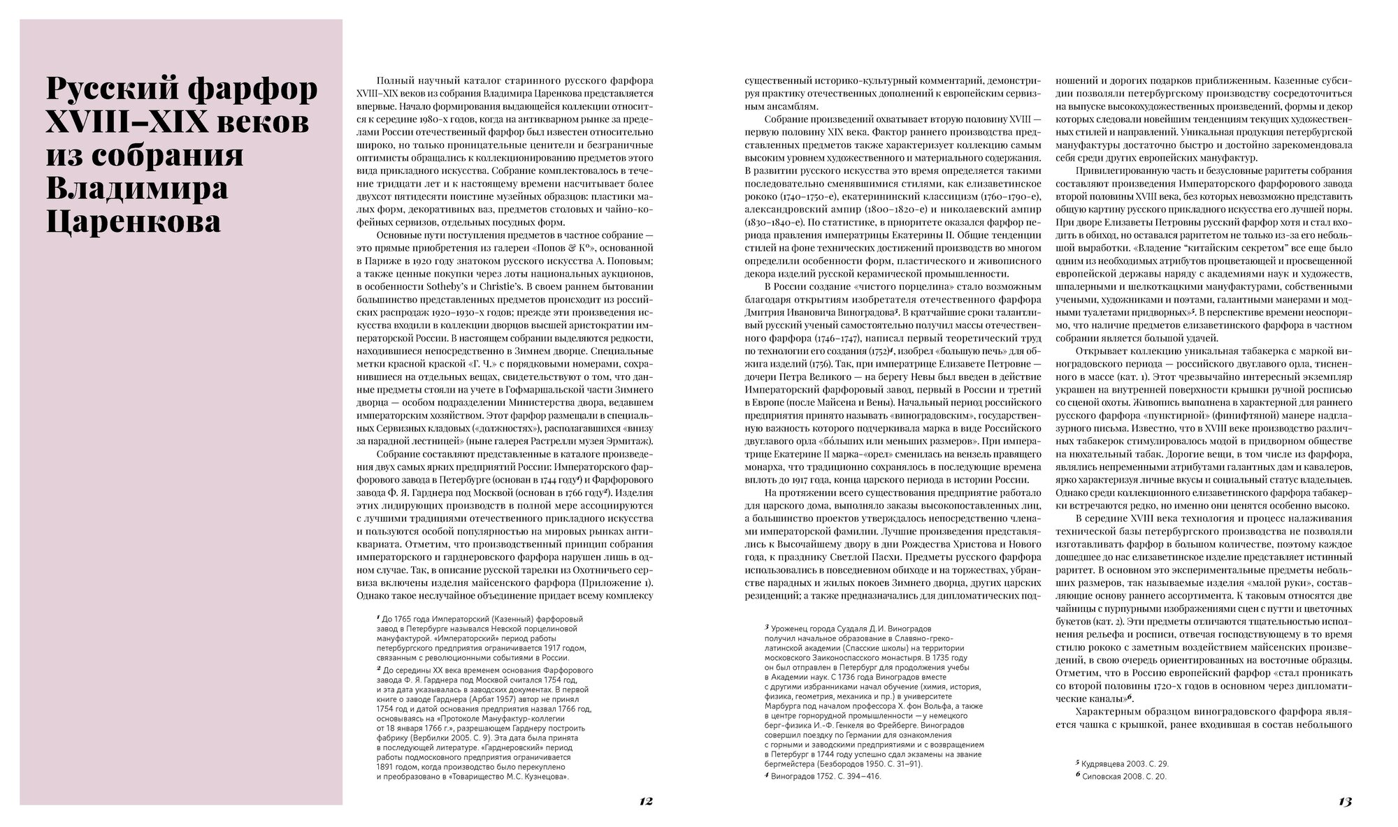 Настоящее издание представляет сводный каталог русского фарфора XVIII-XIX веков из собрания Владимира Царенкова, публикуется впервые. Собрание насчитывает более 250 выдающихся произведений лидирующих производств России: Императорского фарфорового завода в Петербурге и Фарфорового завода Гарднера под Москвой;