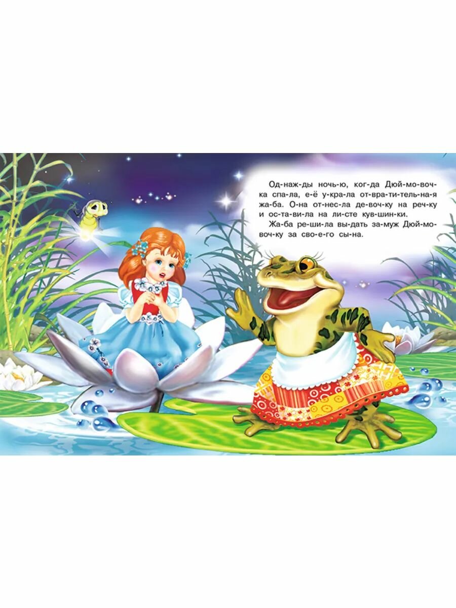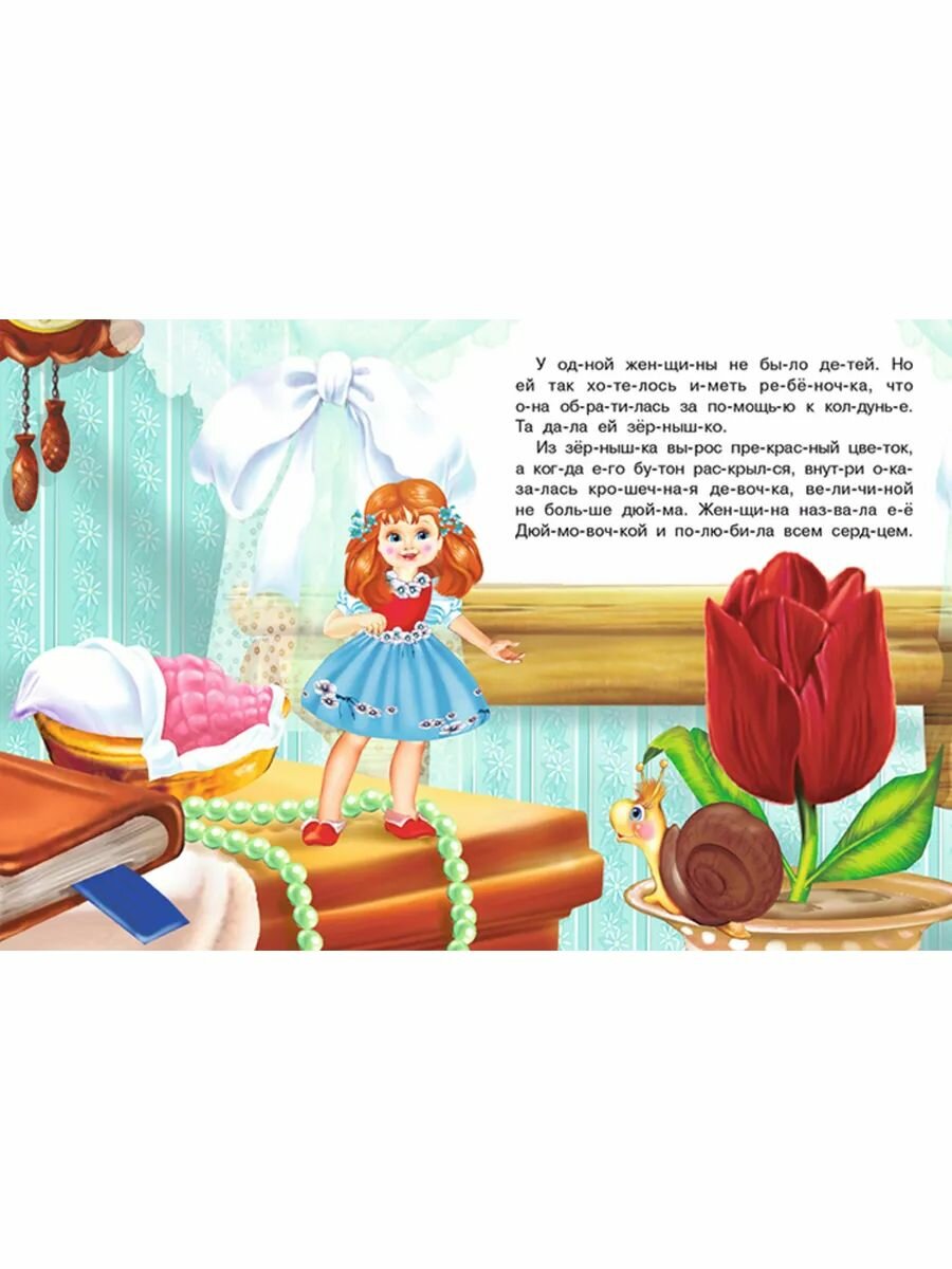 Книжка из серии "Читаем по слогам" включает в себя красочно иллюстрированную сказку "Дюймовочка".