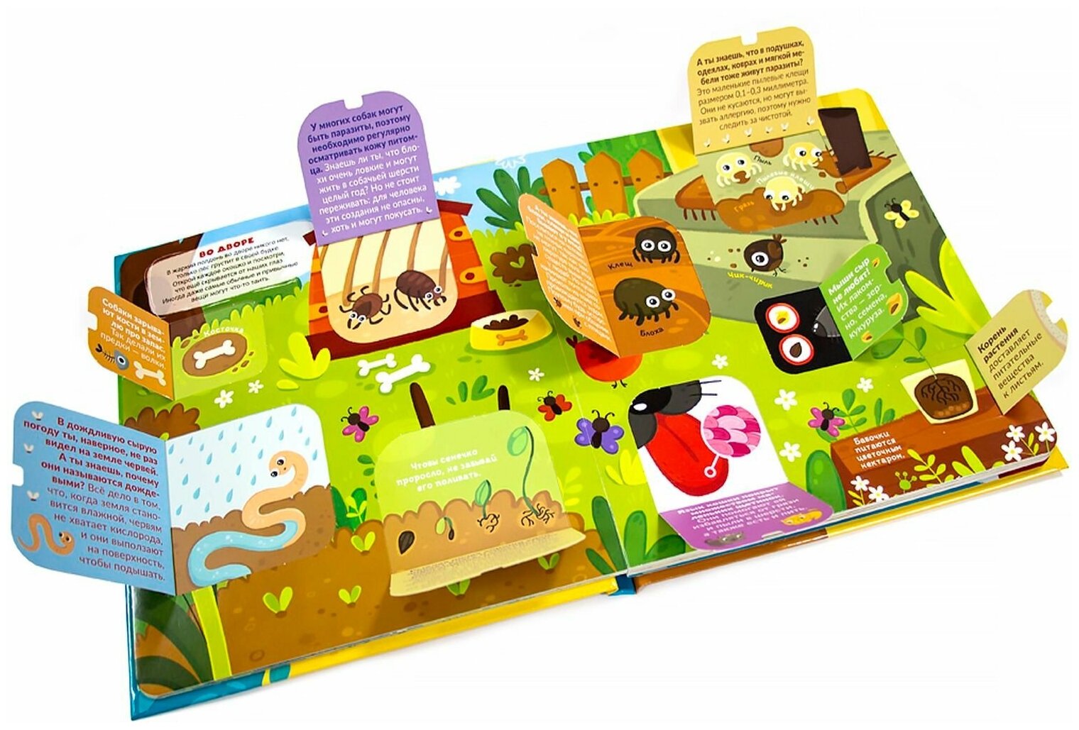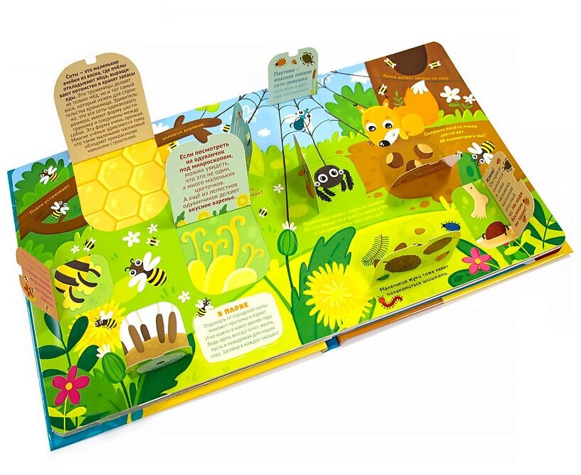 Внутри книжки 8 разворотов с яркими иллюстрациями и 62 окошка с интересными фактами, открывая которые ребёнок сможет познакомиться с удивительным микромиром, скрытым от его глаз. Читайте книжку вместе с вашим ребёнком - проводите время интересно и с пользой!