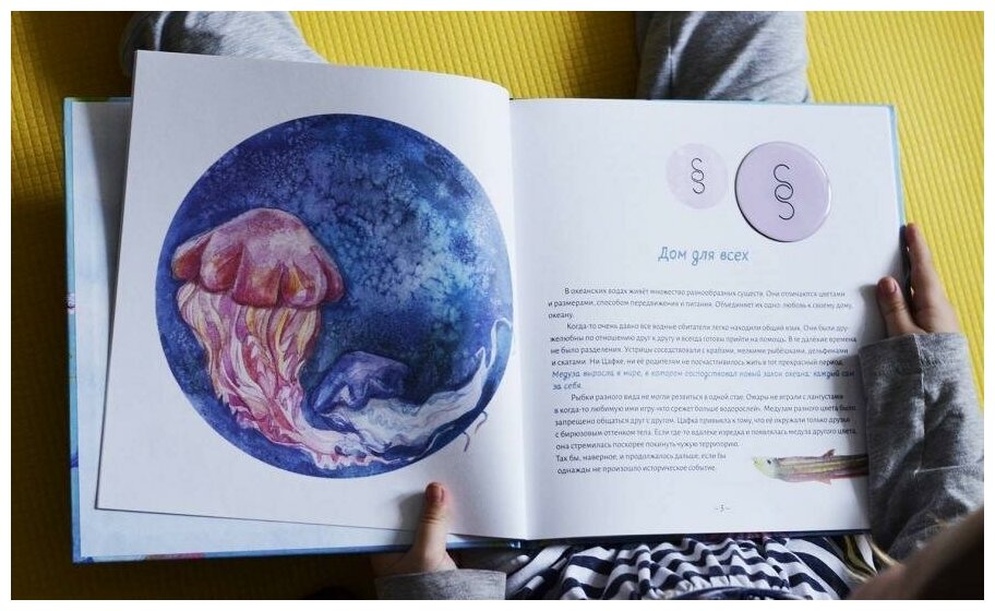 В каждой книге по 6 сказок. Герои во всех сказках разные. Это могут быть и люди, и животные, и морские обитатели, и люди с животными одновременно. У каждой сказки есть свой символ. И эти символы в конце книги сделаны в виде магнитиков. Все книги в твердом переплете, квадратного формата с круглой вырубкой на первой странице. Выглядят интересно и сделаны очень качественно.