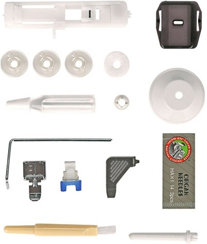 | Комплект поставки | Швейная машинка; ножная педаль; лапка многофункциональная; лапка для петли; лапка для молнии; лапка для пуговицы; линейка-направитель; штопальная пластина; набор игл для машинки (3 шт); фиксаторы для катушки (2 шт); вертикальный катушкодержатель; фетровый амортизатор для катушки; нож-распарыватель петель; набор шпулек (3 шт); щеточка для очистки; ключ универсальный; ящик для хранения аксессуаров; чехол от пыли из нетканого полотна; инструкция; гарантийный талон |