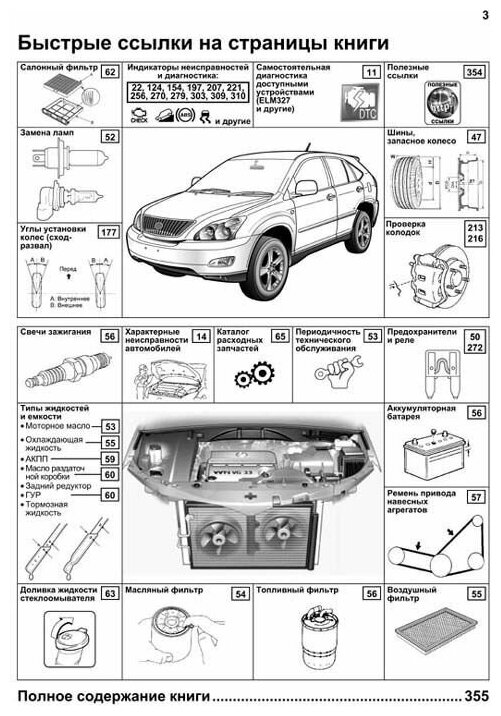 В руководстве дается пошаговое описание процедур по эксплуатации, ремонту и техническому обслуживанию автомобилей Lexus RX300 / 330 2003-2006 гг. выпуска, оборудованных бензиновыми 1MZ-FE (3,0 л) и 3MZ-FE (3,3 л) двигателями. Издание содержит руководство по эксплуатации, подробные сведения по техническому обслуживанию, диагностике, ремонту и регулировке элементов систем двигателя (в т.ч. систем впрыска топлива, изменения фаз газораспределения (VVT), зажигания, запуска и зарядки), элементов автоматических коробок передач (АКПП), раздаточной коробки, заднего редуктора, элементов тормозной системы (включая антиблокировочную систему тормозов (ABS), систему экстренного торможения (ВА), противобуксовочную систему (TRC) и систему курсовой устойчивости (VSC)), рулевого управления (включая систему регулировки положения рулевой колонки), подвески (в т.ч. активная система управления высотой расположения кузова (АНС)), кузовных элементов и систем кондиционирования и вентиляции. Приведены инструкции по диагностике 14 электронных систем: управления двигателем, АКПП, АНС, регулировки положения рулевой колонки, ABS, VSC, AC, SRS, адаптивная система света фар (AFS), Multivision, заднего обзора, иммобилайзера, системы поддержания скорости, электропривода задней двери. Подробно описаны 413 кодов неисправностей Р0, Р1, Р2, СО, С1, ВО, В1, В2, U0, Flash; условия их возникновения и возможные причины. Приведены разъемы и процедуры проверки сигналов на выводах блоков управления различными системами - PinData. Представлены 65 основных электросхем (31 система) для различных вариантов комплектации, описание большинства элементов электрооборудования.