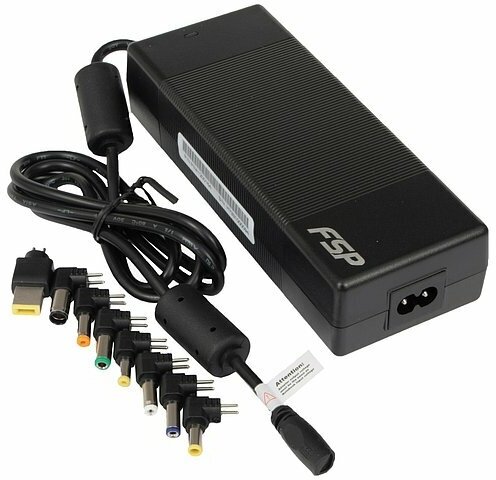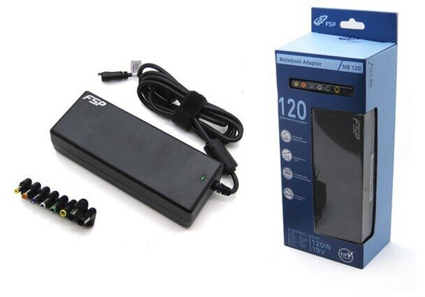 FSP NB V120 — универсальный блок питания для ноутбуков. Рассчитан на выходную мощность 120 Вт. Подходит к лэптопам разных марок, благодаря комплекту из 7 переходников под разные разъемы.
