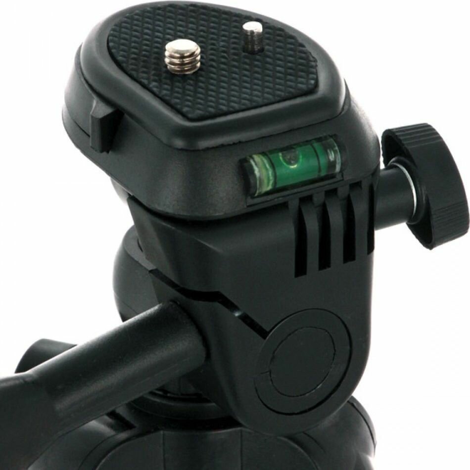 Небольшой, легкий штатив для компактных фотоаппаратов и любительских видеокамер. Выполнен из алюминия и пластика, выдерживает нагрузку до 500 г. Пузырьковый уровень на головке позволяет точно выравнивать камеру по горизонту. В комплекте идет тканевый чехол.