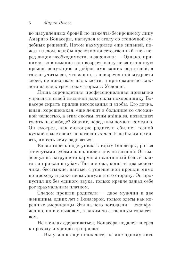 "Крестный отец" – классический роман о жизни одного из могущественных преступных синдикатов Америки – мафиозном клане дона Корлеоне. Написанная с потрясающей достоверностью книга позволяет читателю без риска для жизни заглянуть в святая святых мафии.