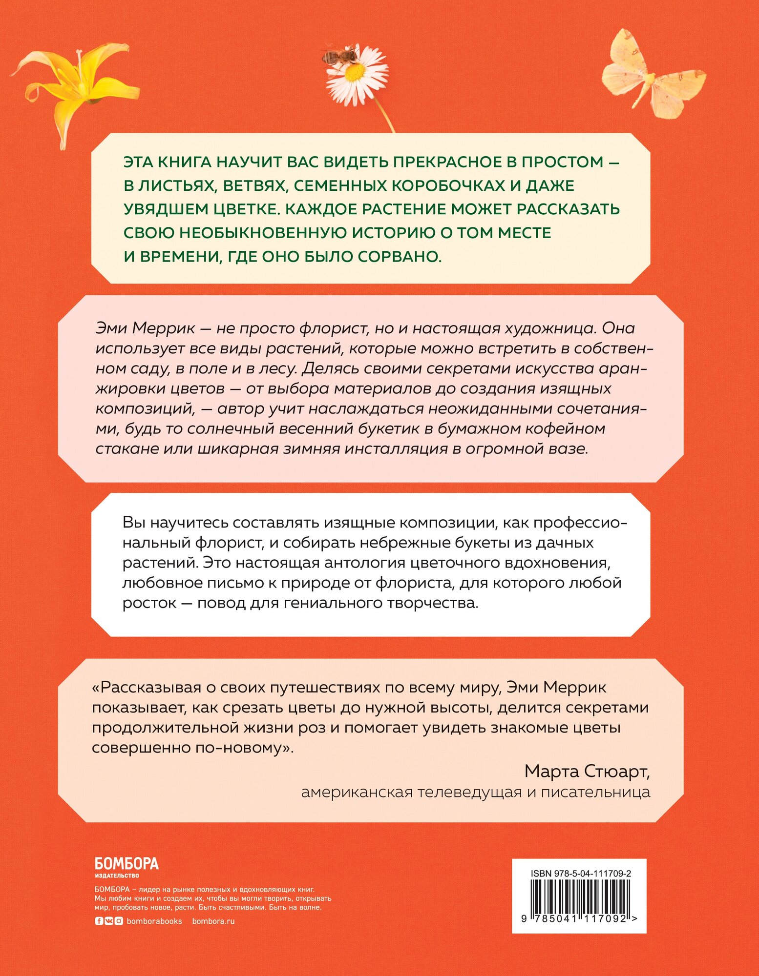 Новинка! Уникальная книга по флористике, которая учит смотреть на растения совершенно по-новому! Благодаря ей составлять чарующие цветочные композиции не составит большого труда. Флорист Эми Меррик расскажет, как собрать идеальный букет к завтраку или в гости, какие акценты сделают даже самую простую композицию прекрасной, а также зачем стоит смотреть на мир через цветочные очки. Каждый разворот книги сопровожден яркими фотографиями или искусными иллюстрациями. Роскошное оформление, высокое качество Вдохновляющая книга для начинающих флористов содержит секреты искусства аранжировки цветов: от выбора материалов до создания изящных композиций. Эми Меррик – не просто флорист, но и настоящая художница, которая использует все виды растений, которые можно встретить в собственном саду, в поле и в лесу, чтобы помочь нам увидеть знакомые цветы совершенно по-новому. Она учит наслаждаться неожиданными композициями – будь то солнечный весенний букетик в бумажном кофейном стакане, или шикарная зимняя инсталляция в огромной вазе. Вы научитесь видеть прекрасное в простом – в листьях, ветвях, семенных коробочках и даже увядшем цветке, каждый из которых может рассказать свою необыкновенную историю о том месте и времени, в которых они были найдены.