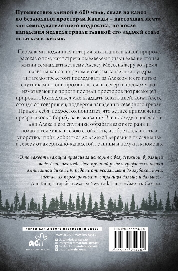 Перед вами подлинная история выживания в дикой природе, рассказ о том, как встреча с медведем гризли едва не стоила жизни семнадцатилетнему Алексу Мессенджеру во время сплава на каноэ по рекам и озерам канадской тундры. Читателю предстоит последовать за Алексом и его пятью спутниками – они продвигаются на север и преодолевают изматывающие пороги посреди просторов потрясающей природы. Поход длился уже двадцать девять дней, когда Алекс, отойдя от товарищей, подвергся нападению северного гризли. Придя в себя, подросток понимает, что летнее приключение превратилось в борьбу за выживание. Все последующие часы и дни Алекс и его спутники обрабатывают его раны и полагаются лишь на свою стойкость, изобретательность и упорство, чтобы добраться до далекой деревни в тысяче миль к северу от американо-канадской границы и получить помощь.