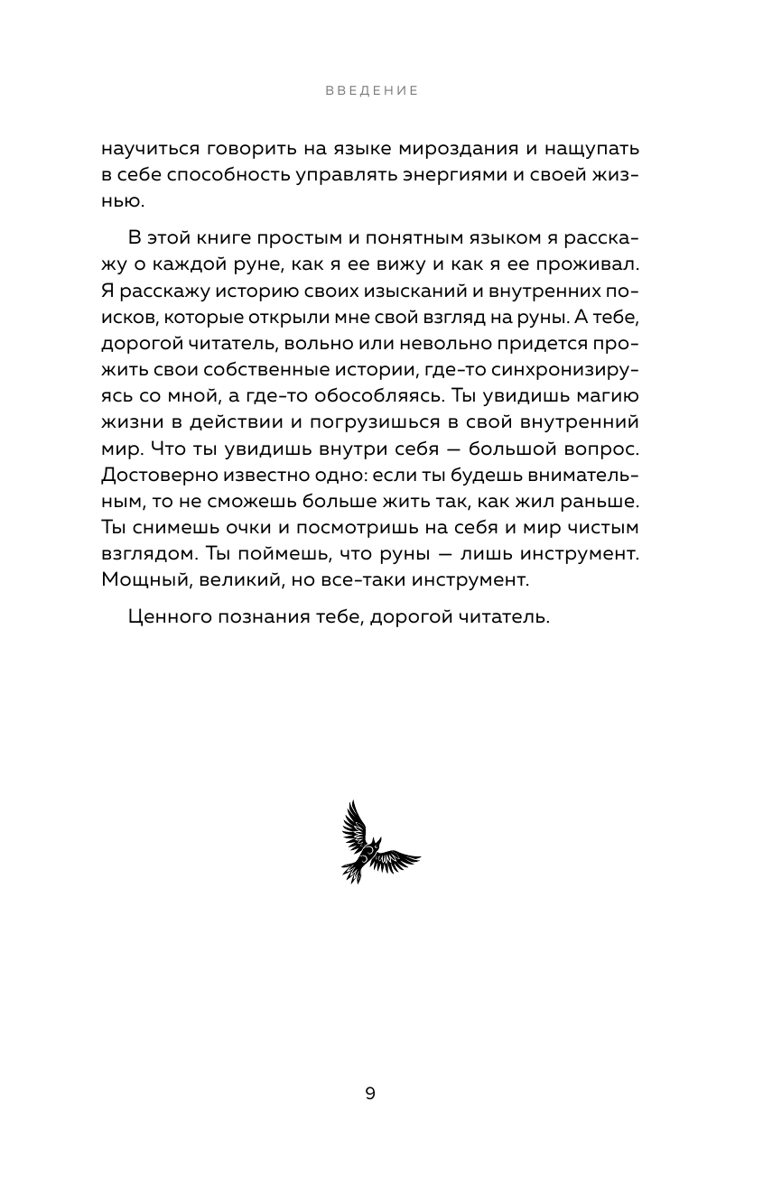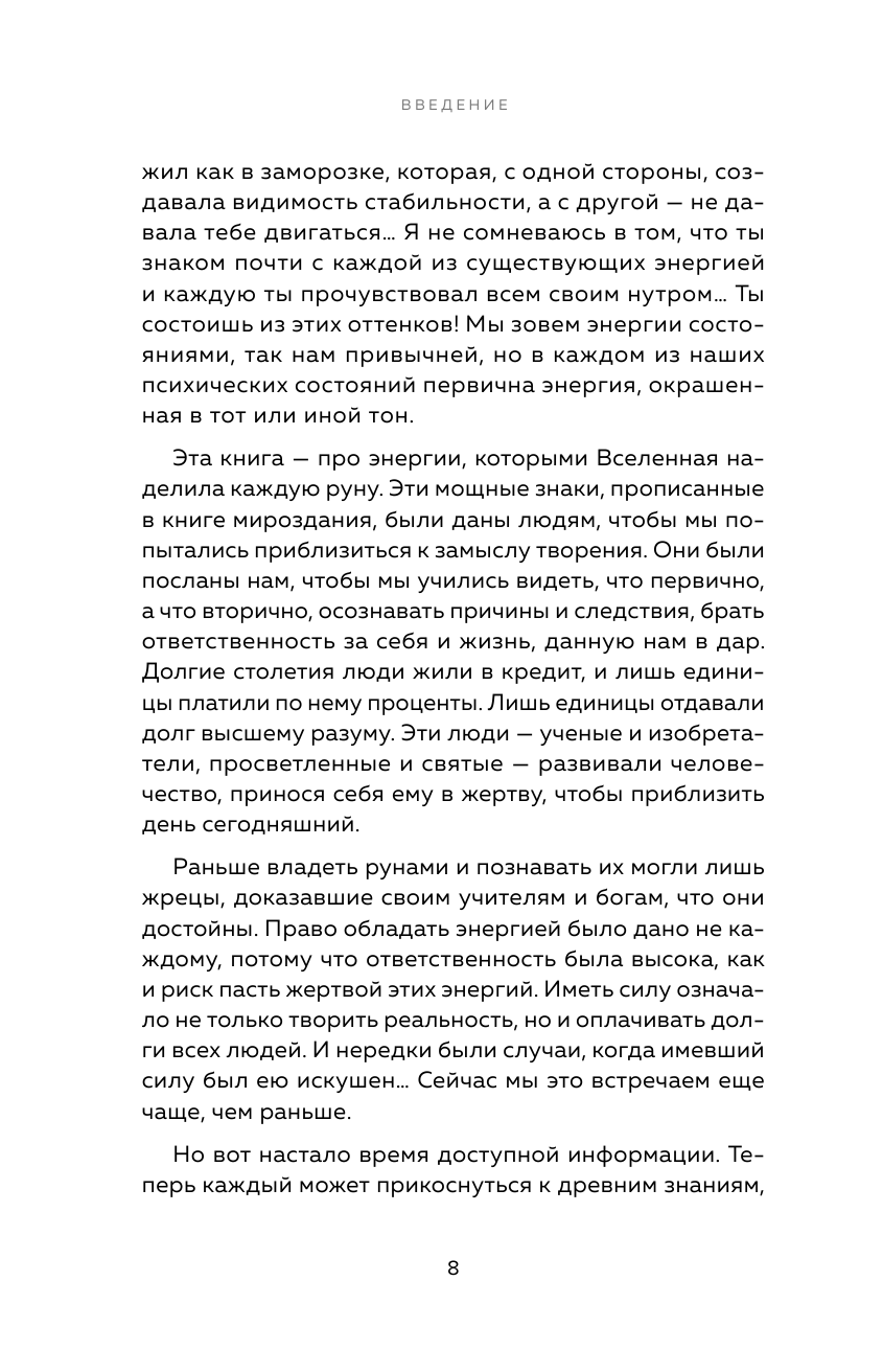 Удивительная книга ! Для тех,кто хочет качественно изменить свою жизнь,стать хозяином своей судьбы и понимать суть происходящего.Автор книги,живым и доступным языком объясняет,как практически использовать руны,для достижения наилучшего результата.Книга разделена на 5 частей : Начало пути(личная история автора и тема рунного набора,как выбрать,где хранить руны и как активировать и использовать)