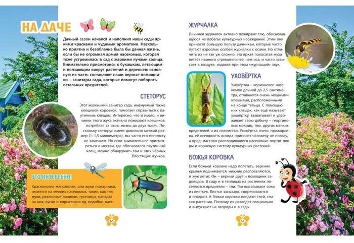 Наша первая энциклопедия. Сыну 6 лет, читаю ему сама, а он смотрит картинки. Месяц просит читать только эту книгу, даже брали её в отпуск и читали в самолёте.Информация подана интересно, дозированно, соответствует возрасту 5+. Сама узнала много интересного- например, что саранча это тот же кузнечик, но очень голодный и с длинными усиками, что майский жук,оказывается,откладывает личинки очень глубоко, аж на 2штыка лопаты, ну и многое другое. Сейчас хочу купить другие энциклопедии именно из этой серии.
