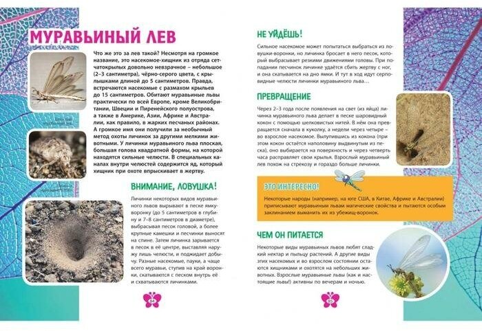 Из этой красочной энциклопедии ты узнаешь, почему их так назвали, зачем нужны шмели и божьи коровки, где обитают самые необычные насекомые, какими удивительными способностями они обладают, познакомишься с муравьиным львом и орхидейным богомолом, а также с самыми большими и самыми красивыми насекомыми в мире.