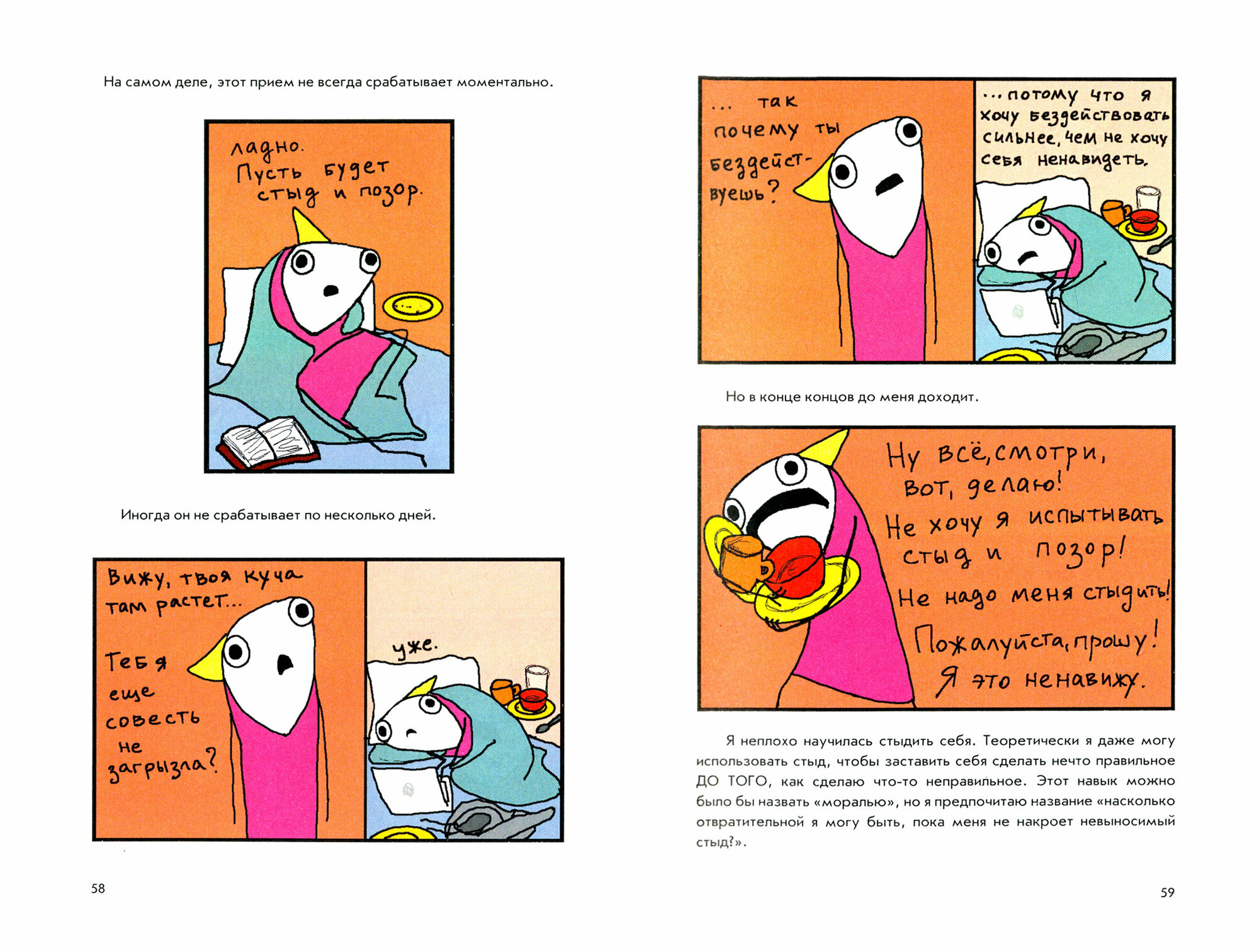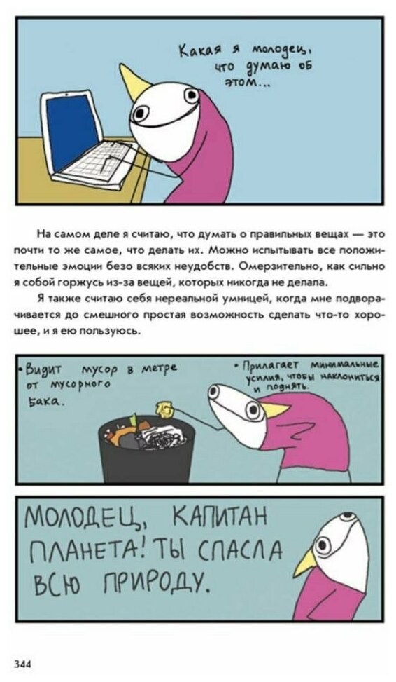Мне хочется сказать лаконично и при том попасть в самую суть: Элли Брош прекрасный автор комиксов, но она совсем не писатель. Думается, что сделать книгу комиксов, добавив в нее некачественный текст была не ее идея, а, скажем, агента, друга, мамы. А может она не сама их писала? Может монстр из ее кошмаров пришел и испортил комиксы этими непонятными откровениями про тщетность бытия? Тексты вне картинок - это что-то чужеродное, совсем непонятное. Они не работают ни для повествования, ни для объяснения того, что происходит на иллюстрации. Стоило выпустить просто сборник комиксов.